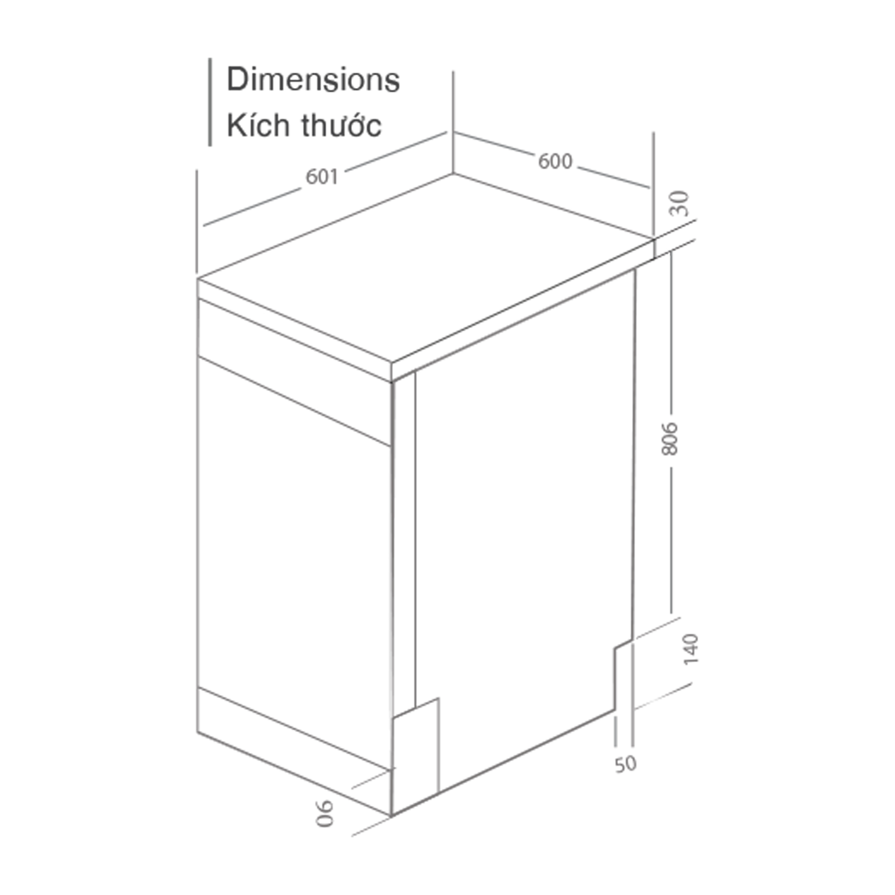 Kích thước sản phẩm: 565x610x550mm Điện áp: 220-240V/ 50-60Hz Mức tiêu thụ điện năng tiêu chuẩn: 0.65kw/lần rửa Phụ kiện đi kèm: 1 vòi liên nước Tặng Combo muối rửa + Chân đế máy