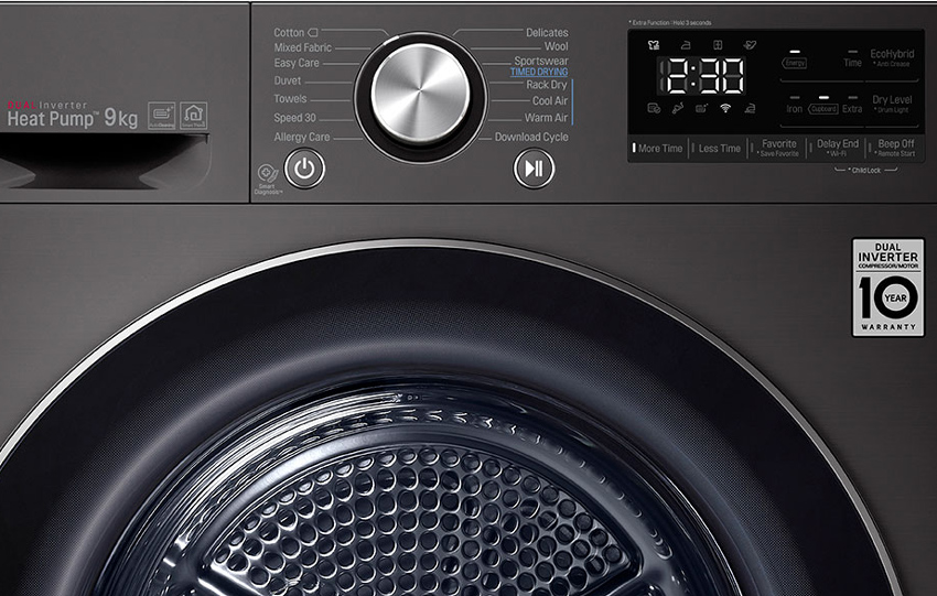 Máy sấy LG có thể sấy tối đa 9 kg quần áo cho mỗi lần sấy, phù hợp với những gia đình có 3 – 5 thành viên.