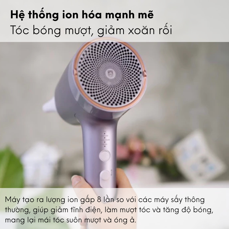 - Hệ thống chăm sóc ion với nhiều ion gấp 8 lần Các ion tăng cường độ bóng cho mái tóc của bạn để tạo kiểu bóng mượt, không bị xoăn. Hệ thống ion mạnh mẽ của chúng tôi tạo ra tới 80 triệu ion mỗi phiên sấy tóc.