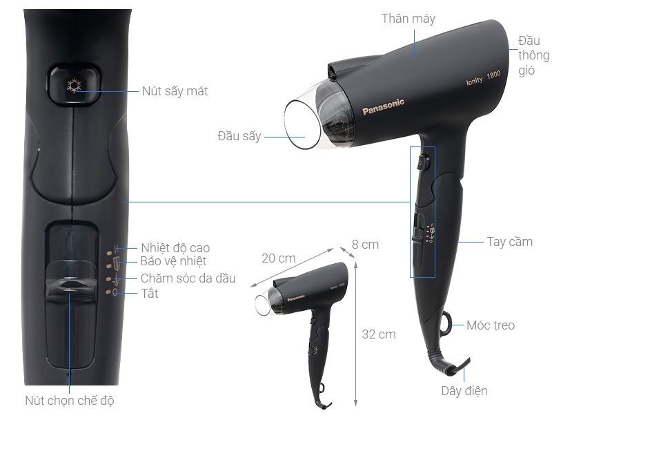 Máy sấy tóc Panasonic với thiết kế nhỏ gọn, dễ cầm nắm cùng công suất hoạt động mạnh mẽ 1800W giúp tóc nhanh khô, tiết kiệm thời gian sấy tóc Có 2 tốc độ sấy