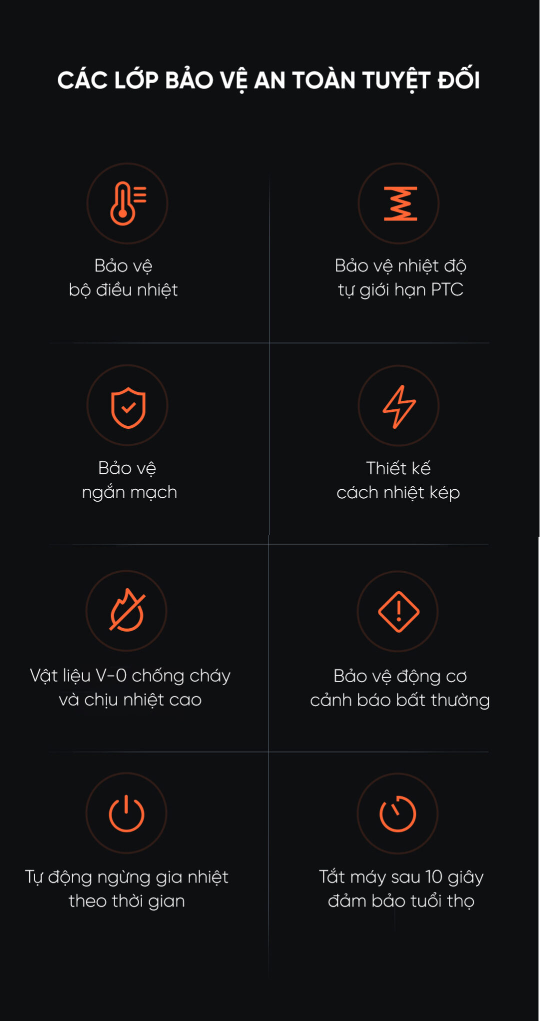 ĐẶC ĐIỂM NỔI BẬT - Công nghệ sưởi không đốt cháy Oxi, giữ ấm cho da - Sử dụng an toàn chống nước IPX4, chống chập điện - Công tắc độc lập dễ dàng điều