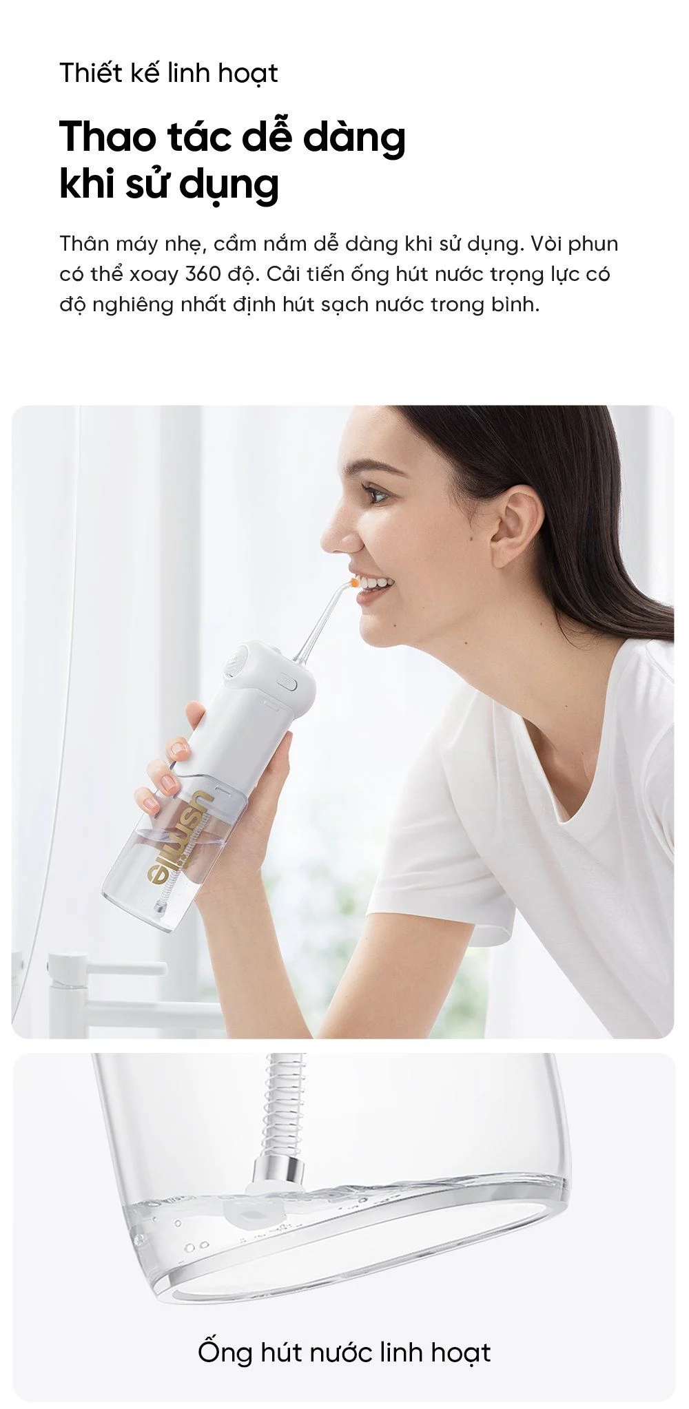 Máy tăm nước usmile C10 có thiết kế nhỏ gọn, tháo lắp linh hoạt và rất dễ sử dụng bằng các nút có sẵn trên thân máy, thuận tiện cho mọi đối tượng người dùng.