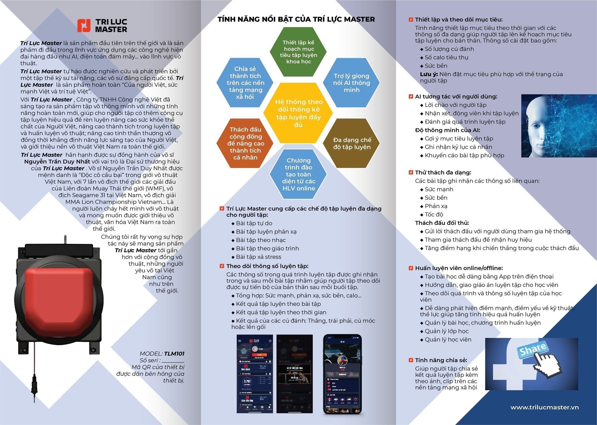 MODEL : TLM101 KT: 400x400x585mm Mã QR của thiết bị được dán bên hông của thiết bị. SẢN XUẤT VÀ PHÂN PHỐI BỞI Công ty TNHH Công nghệ Việt Trí Lực Master là sản phẩm đầu tiên trên thế giới và là sản phẩm đi đầu trong lĩnh vực ứng dụng các công nghệ hiện đại hàng đầu như AI, điện toán đám mây… vào lĩnh vực võ thuật. Trí Lực Master tự hào được sinh ra từ một tập thể kỹ sư tài năng, các võ sư đẳng cấp quốc tế. Trí Lực Master là sản phẩm hoàn toàn “Của người Việt, sức mạnh Việt và trí tuệ Việt”. Với Trí Lực Master, Công ty TNHH Công nghệ Việt đã sáng tạo ra sản phẩm tập võ thông minh với những tính năng hoàn toàn mới, giúp cho người tập có thêm công cụ tập luyện hiệu quả để rèn luyện nâng cao sức khỏe thể chất của Người Việt, nâng cao thành tích trong luyện tập và huấn luyện võ thuật; nâng cao tinh thần thượng võ đồng thời khẳng định năng lực sáng tạo của Người Việt, và giới thiệu nền võ thuật Việt nam ra toàn thế giới. Trí Lực Master hân hạnh được sự đồng hành của võ sỹ Nguyễn Trần Duy Nhất với vai trò là Đại sứ thương hiệu của Trí Lực Master. Võ sỹ Nguyễn Trần Duy Nhất được mệnh danh là “Độc cô cầu bại” trong giới võ thuật Việt Nam, với 7 lần vô địch thế giới các giải đấu của Liên đoàn Muay Thái thế giới (WMF), vô địch Seagame 31 tại Việt Nam, vô địch giải MMA Lion Championship Vietnam… và là người luôn cháy hết mình với võ thuật và mong muốn được giới thiệu võ thuật, văn hóa Việt Nam ra toàn thế giới. Chúng tôi rất hy vọng sự hợp tác này sẽ mang sản phẩm Trí Lực Master tới gần hơn với cộng đồng võ thuật, những người yêu võ tại Việt Nam cũng như trên thế giới.