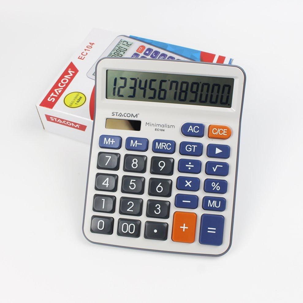 Máy Tính Stacom Ec104 Thuộc dòng máy tính cầm tay cỡ lớn, màn hình hiển thị lớn với 12 số. Hai nguồn điện cung cấp từ năng lượng ánh sáng và pin giúp máy luôn