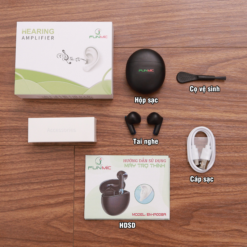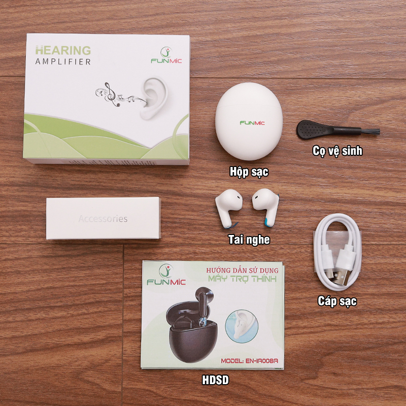 Không đeo máy trợ thính khi tắm, bơi lội, khi trời mưa to hoặc trong bầu không khí ẩm ướt như phòng tắm hơi. Thông số kỹ thuật của tai nghe trợ thính Funmic EN-IA008A: Model: EN-IA008A Thương hiệu: Funmic Âm thanh khuếch đại tối đa: <117dB SPL Âm thanh khuếch đại trung bình: <111dB SPL Tăng âm thanh tối đa: <40dB Tăng âm thanh trung bình: <35dB Độ méo tiếng: ≤5% Dải tần số: F1≤250Hz, F2≥5000Hz Tiếng ồn đầu vào: ≤29dB+3dB Cường độ dòng điện: ≤5mA Pin sạc: Lithium Thời gian sạc tai nghe: khoảng 2 giờ Trọng lượng sản phẩm: 3.5g Kích thước sản phẩm: 28 x 18 x 19mm Kích thước đóng gói: 120 x 90 x 35 mm Trọng lượng đóng gói: 136g Màu sắc: Trắng / Đen Sản phẩm có số công bố của Sở Y Tế cấp: 240002566/PCBB-HCM Sản phẩm đạt giấy chứng nhận ISO13485, CE, RoHS Sản phẩm bao gồm: