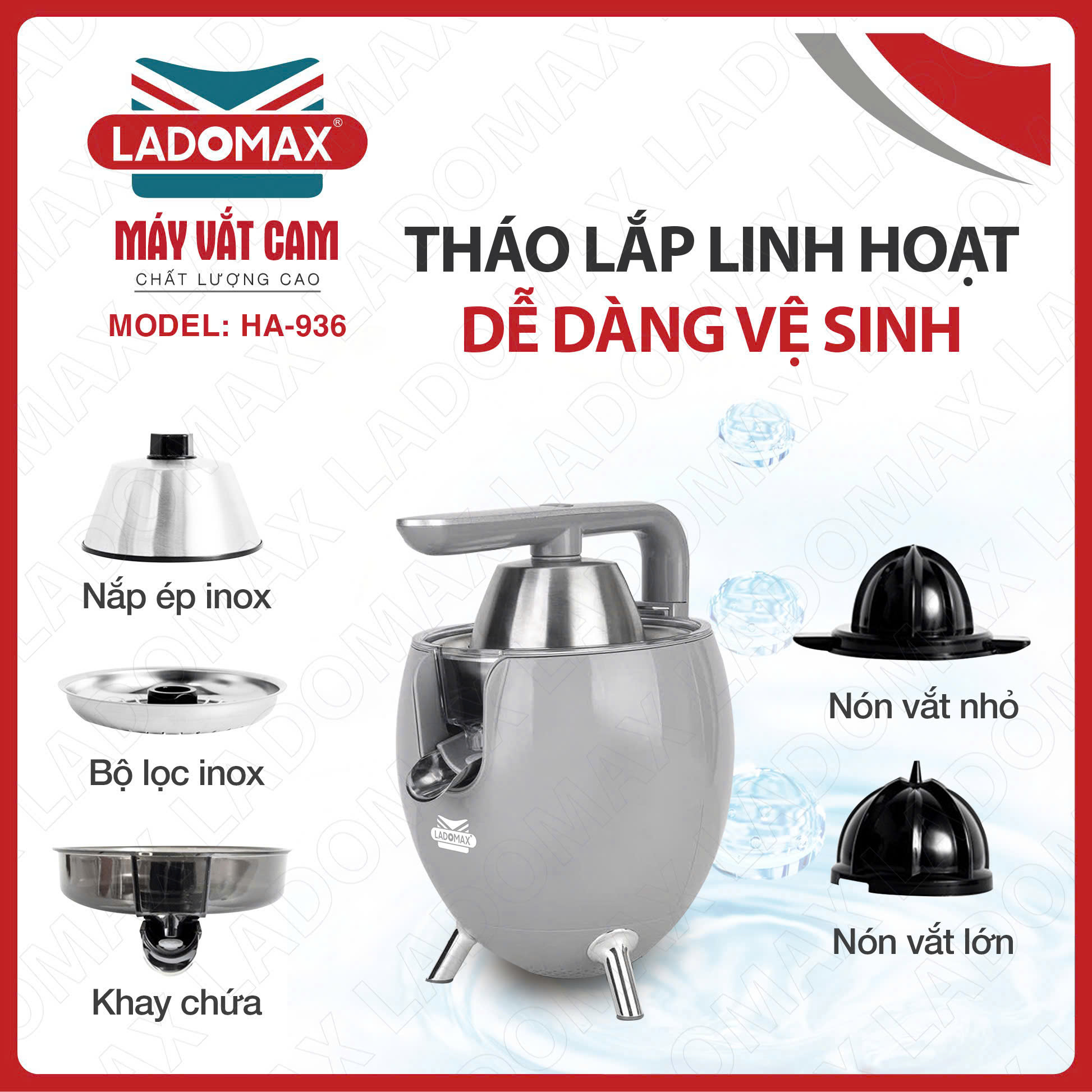 Mua tại TiktokThông tin sản phẩm Thương hiệu: Ladomax Máy: Máy vắt cam, vắt chanh Công suât: 860W Model :HA936 Núm: 2 đầu nấm lớn nhỏ Khay lọc: Inox Điện áp: 220-240V, 50/60HZ Bảo hành 12 tháng - có linh kiện thay Thương hiệu: Ladomax Máy vắt cam rất thích hợp dùng cho quán kinh doanh và cả gia đình Trong thời đại hiện nay mỗi gia đình đều tìm một thiết bị tốt để giúp ép nhanh những quả cam tươi ngon cho cả gia đình uống, THì đây là sự lựa chọn không thể thiếu ạ, Máy này chuyên dùng quán và gia đình thường xuyên uống nước cam cũng có thể đầu tư 1 em nhé