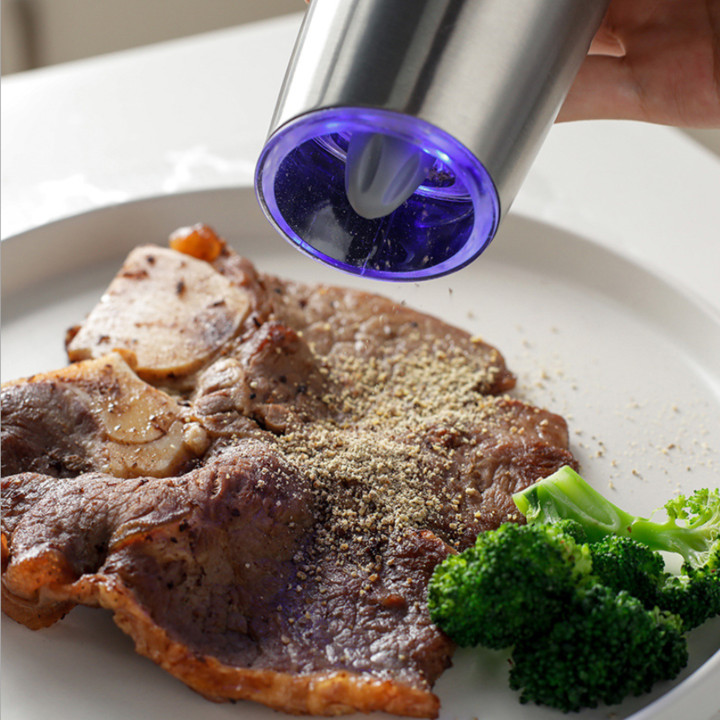 - Máy Nghiền Hạt Tiêu sáng tạo phân tán gia vị với đèn LED màu xanh bật khi máy xay hạt tiêu đang hoạt động.