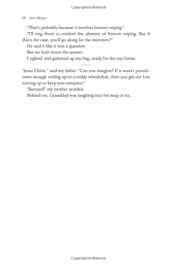 Will is acerbic, moody, bossy-but Lou refuses to treat him with kid gloves, and soon his happiness means more to her than she expected. When she learns that Will has shocking plans of his own, she sets out to show him that life is still worth living.