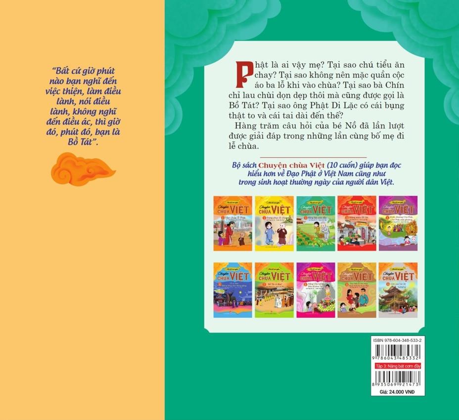Thông qua câu chuyện bé Nồ cùng gia đình đi lễ chùa, vào chùa gặp Sư trụ trì và chú tiểu Tâm Tĩnh, bộ Mẹ kể con nghe – Chuyện chùa Việt lần lượt hé mở những kiến thức cơ bản về đạo Phật.