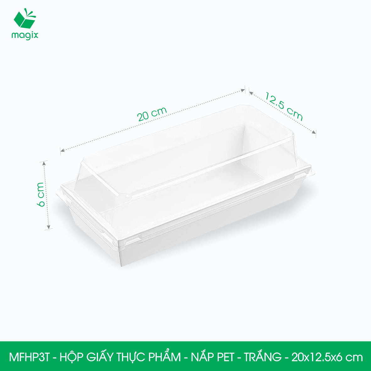 ✨MFHP3T - 20x12.5x6 cm - 100 hộp giấy thực phẩm màu trắng nắp Pet, hộp giấy chữ nhật đựng thức ăn, hộp bánh nắp trong