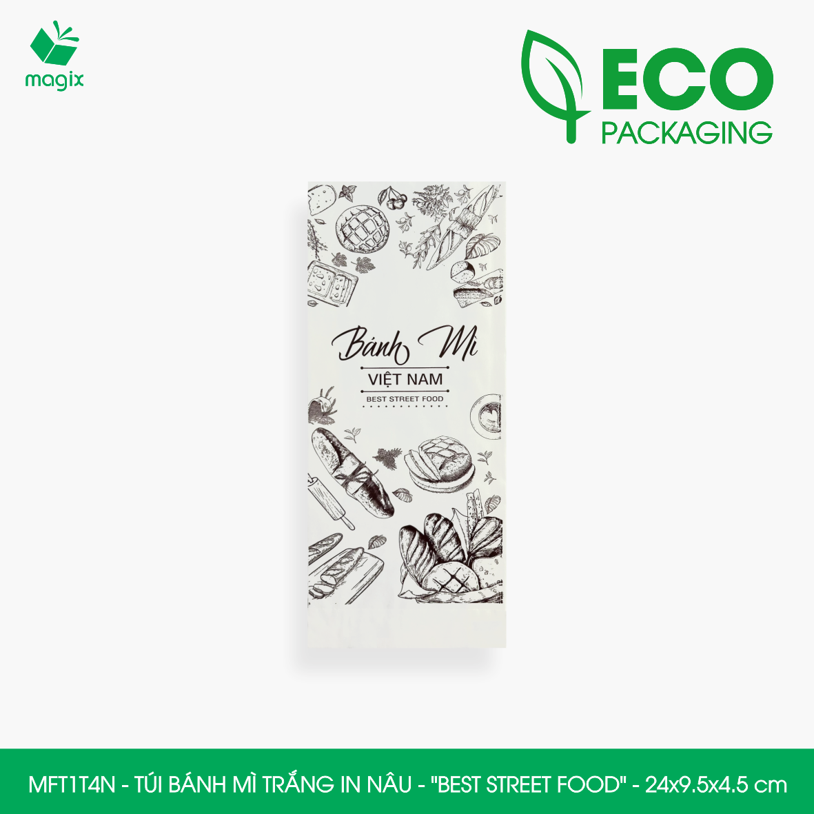 • MFT1T4X - Túi bánh mì trắng in xanh lá - "Best street food" - 24x9.5x4.5 cm