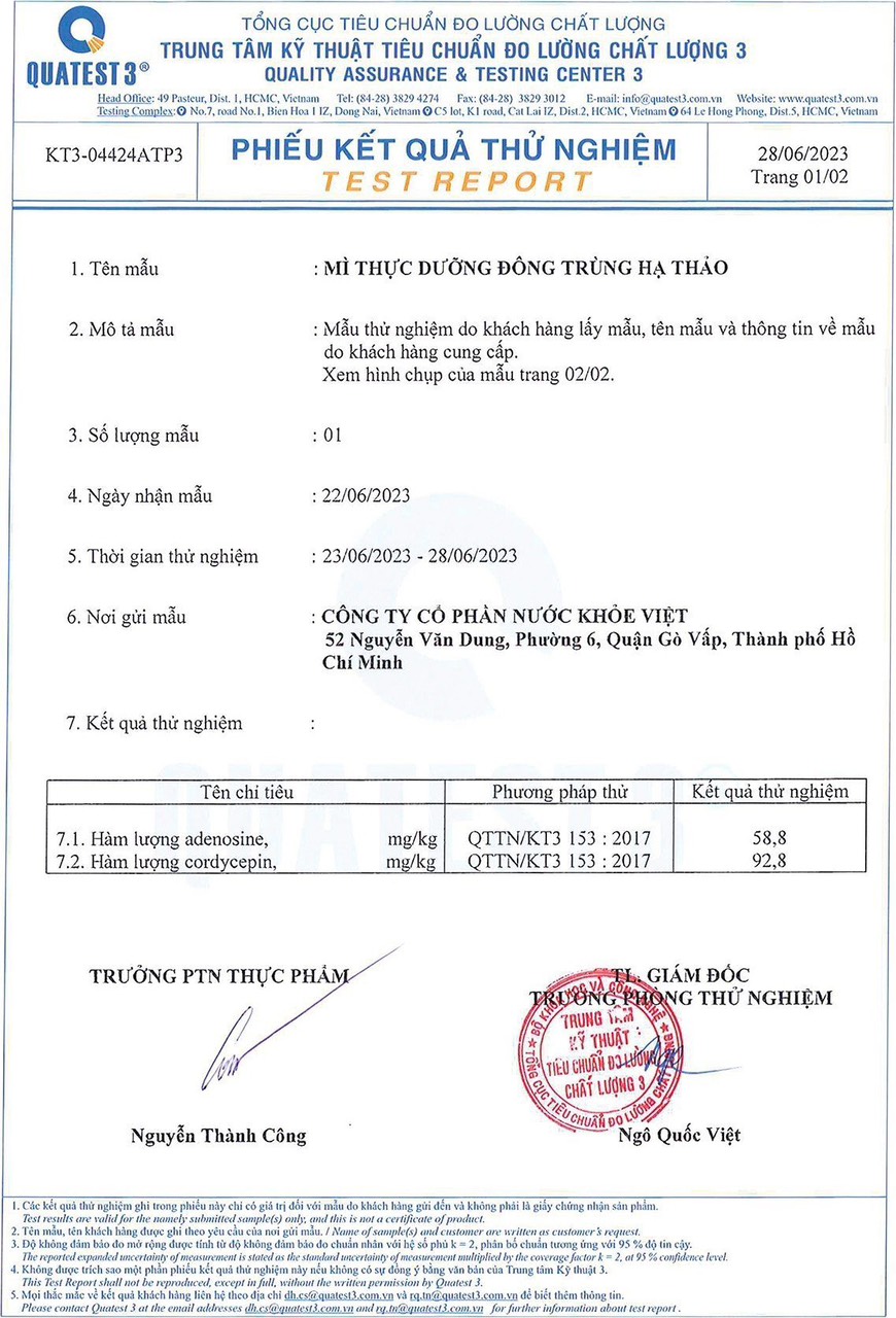 - Gói lớn 75 gam, đủ đầy cho bữa chính. Hình ảnh sản phẩm: Thành phần: Vắt mì: Bột mì, tinh bột khoai mì, 5% bột đông trùng hạ thảo SK, shortening, muối, chất làm dày (E412), chất tạo xốp (E500(i), E500(ii)), chất ổn định (E452(i), E501(i)), màu thực phẩm tổng hợp (E110), chất chống oxy hóa (E321). Các gói gia vị: Sợi đông trùng hạ thảo (50 g/kg), muối ăn, dầu cọ tinh luyện, chất điều vị (E621, E627, E631), đường, bột nấm (25 g/kg), rau (20 g/kg)[cà rốt sấy, ba rô sấy], tiêu, ớt, tỏi, màu hạt điều tự nhiên, ngũ vị hương, chất điều chỉnh độ acid (E330). INGREDIENTS: Noodles: Wheat flour, tapioca starch, 5% Cordyceps SK powder, shortening, salt, thickening agent (E412), foaming agent: (E500 (i), E500 (ii)), stabilizer (E452 (i), E501 (i)), color synthetic food (E110), antioxidant (E321). Soup base: Cordyceps militaris (50 g/kg), salt, refined palm oil, flavor enhancers: (E621, E627, E631), sugar, mushroom powder (25 g/kg), vegetable (20 g/kg) [dried carrots, three dried periwinkle], pepper, chili, garlic, annatto oil, five-spice powder, acidity regulator (E330). GIÁ TRỊ DINH DƯỠNG: Nấm Đông Trùng Hạ Thảo được biết đến nhiều nhất là Cordyceps Sinensis và Cordyceps Militaris, trong đó Cordyceps Militaris có tính năng vượt trội về dược chất có lợi cho sức khỏe con người. Mì Thực Dưỡng Đông Trùng Hạ Thảo bổ sung hàm lượng lớn vitamin, khoáng chất, nguồn năng lượng dồi dào, bồi bổ giúp cơ thể luôn khỏe mạnh và chống suy nhược. Mì Thực Dưỡng Đông Trùng Hạ Thảo có chỉ số năng lượng cao, đối với những người lười chán ăn, thì đây được xem là loại thực phẩm rất phù hợp để cung cấp năng lượng nhanh nhất. Có thể sử dụng liên tục trong thời gian dài mà không lo nóng gan, nổi mụn, v.v… HƯỚNG DẪN SỬ DỤNG / COOKING DIRECTIONS: