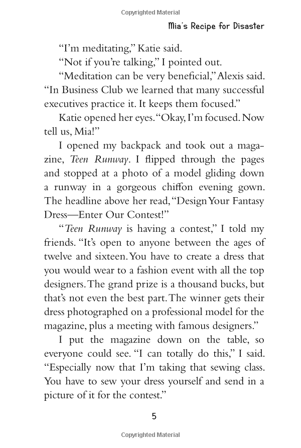 Mia is excited to enter a Design-a-Dress contest, but she's pressed for time. And when she tries to finish working on her dress during a Halloween cupcake party, it's a recipe for disaster! When Mia reads about a Design-a-Dress contest in a magazine for "budding designers ages 12-16" she is excited. But she doesn't realize how much work designing--and sewing--a dress truly is until she starts on her contest entry.