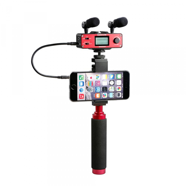 Smart Mixer còn đi kèm với một báng cầm tay bằng nhôm để ghi khi đang di chuyển hoặc nó có thể được gắn trên giá ba chân để sử dụng tại chỗ. Giá đỡ thiết bị đi kèm cho phép sử dụng SmartMixer theo hướng ngang hoặc dọc.
