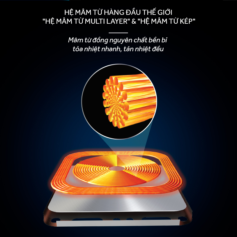 • Bếp 03 từ • Mặt kính Schott Ceran Made in Germany • Bo mạch EGO Made in Germany • Công nghệ biến tần INVERTER tiết kiệm 40% điện năng • Chức năng Booster nấu