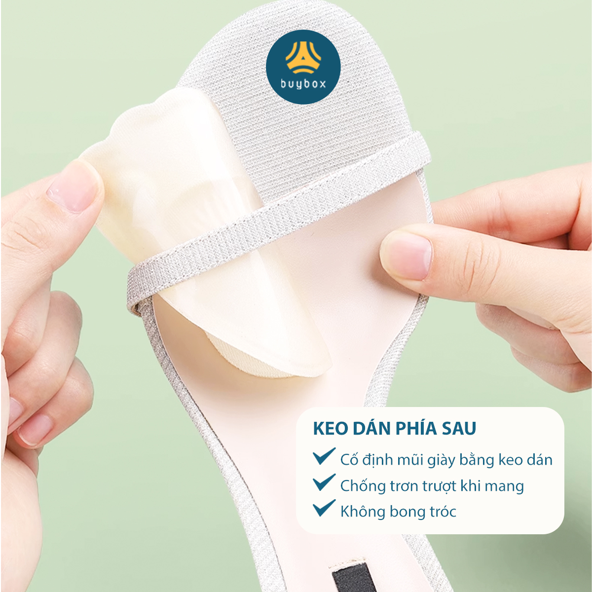 2. Đặt lót múi giày vào phía trước phần mũi và các ngón chân Lưu ý: Sản phẩm mang thương hiệu buybox có bao bì in logo và hướng dẫn sử dụng chi tiết đi kèm.   NHẮN GỬI KHÁCH HÀNG buybox mong muốn đồng hành trên con đường mang lại sự ÊM ÁI & THOẢI MÁI nhất cho đôi chân Khách Hàng. Luôn mang đến những sản phẩm chất lượng và giá thành tốt nhất, không ngừng tiếp thu để cải tiến nhằm phục vụ tôn chỉ chung - MANG LẠI SỰ THOẢI MÁI NHẤT CHO ĐÔI CHÂN CỦA BẠN!!!