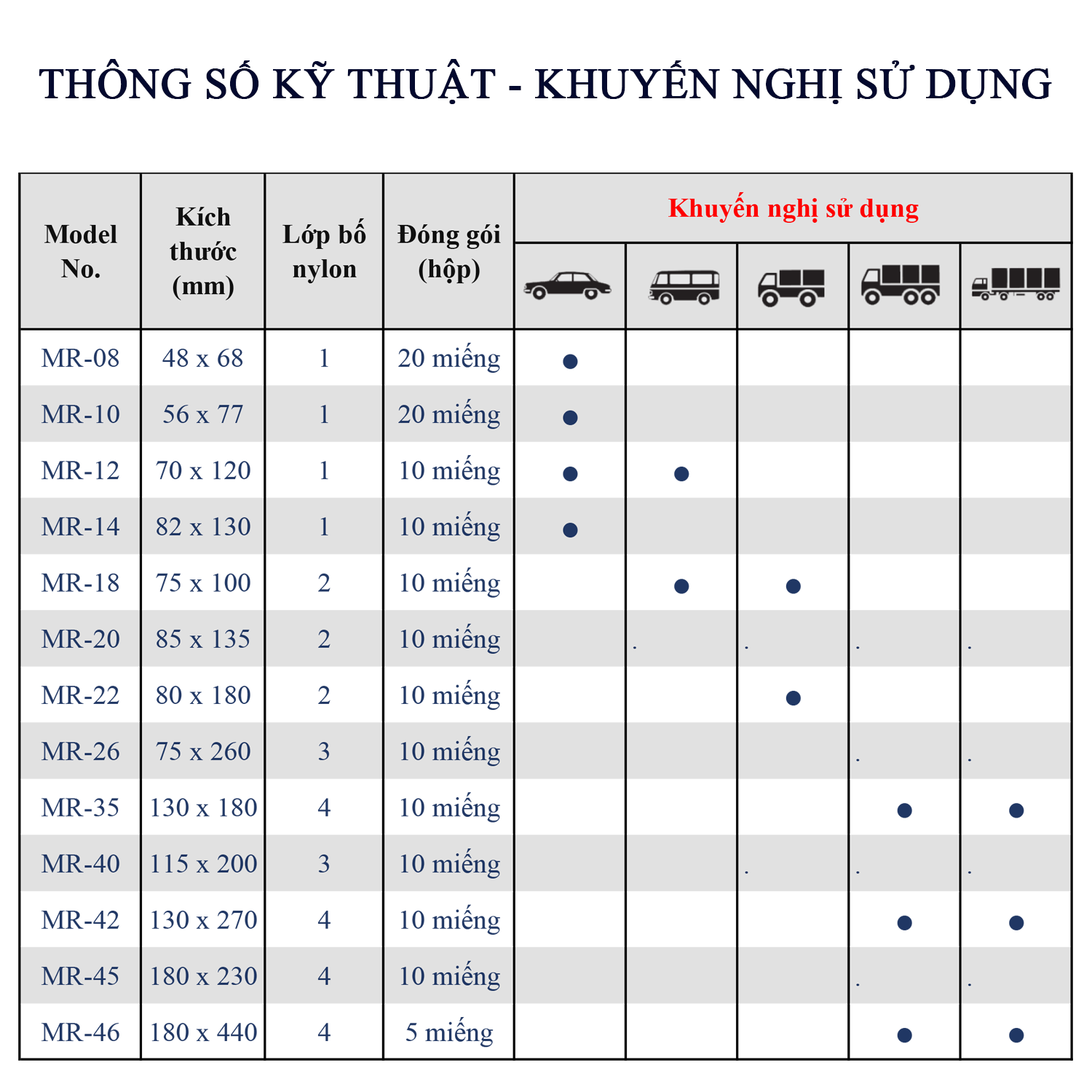 Đối với xe du lịch các Model thường hay dùng như: MR-08, MR-10, MR-12, MR-14, MR-18