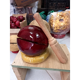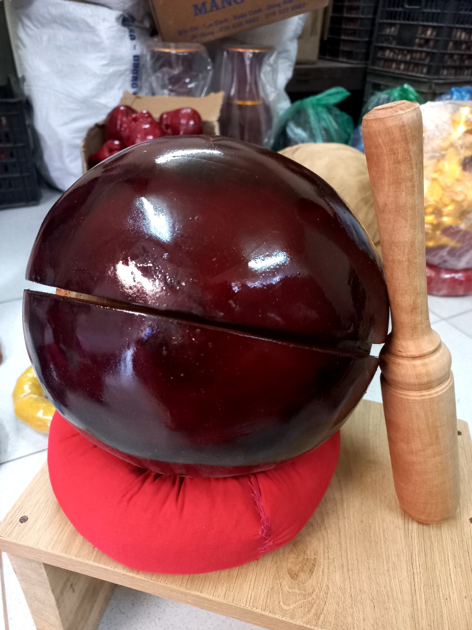 _ Mõ tụng kinh niệm phật được làm bằng chất liệu gỗ mít liền khối tự nhiên 100% ,Và được sơn pu phun mầu mận chín _ Kích thước 12cm + dùi đánh và đế