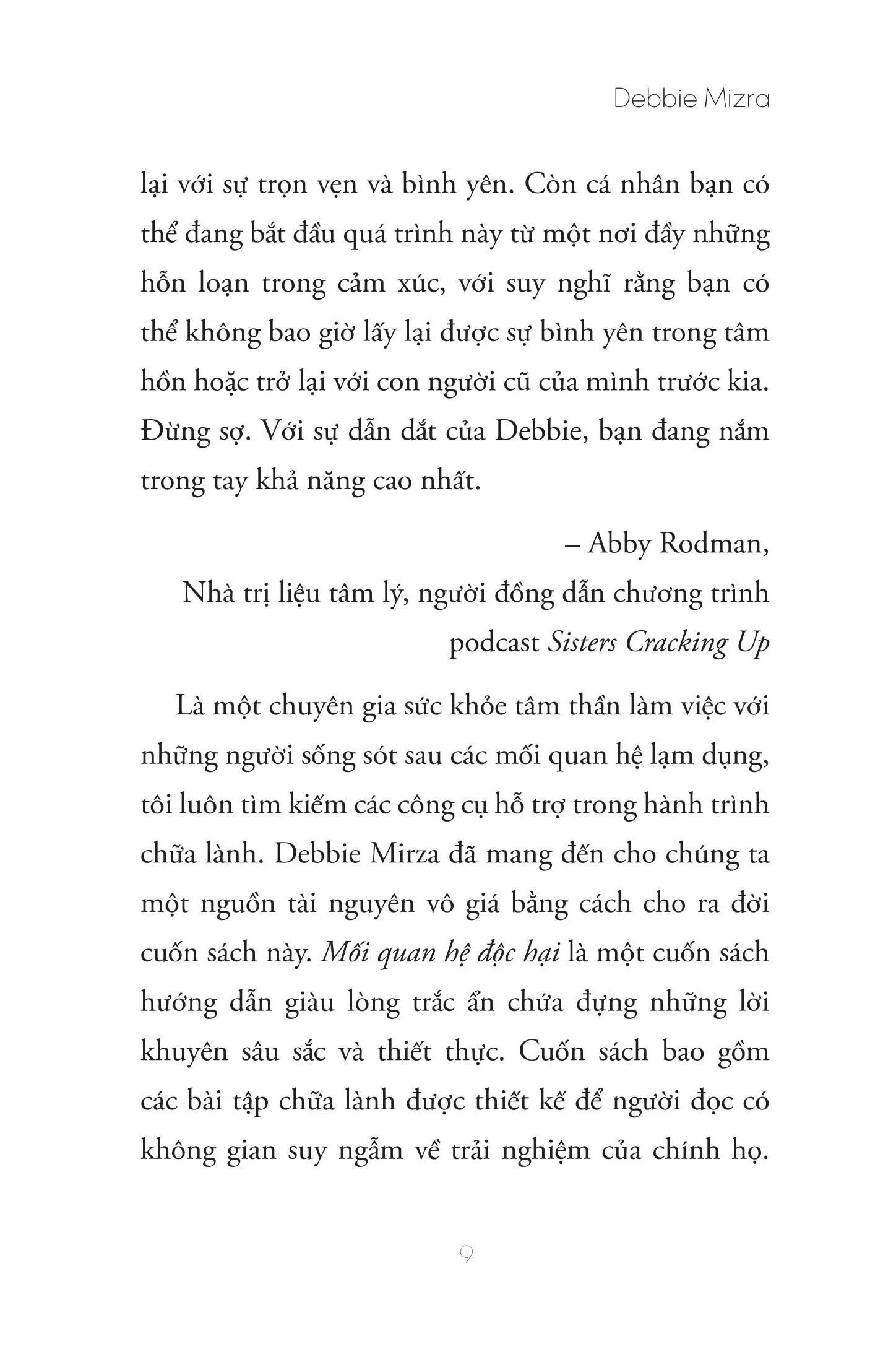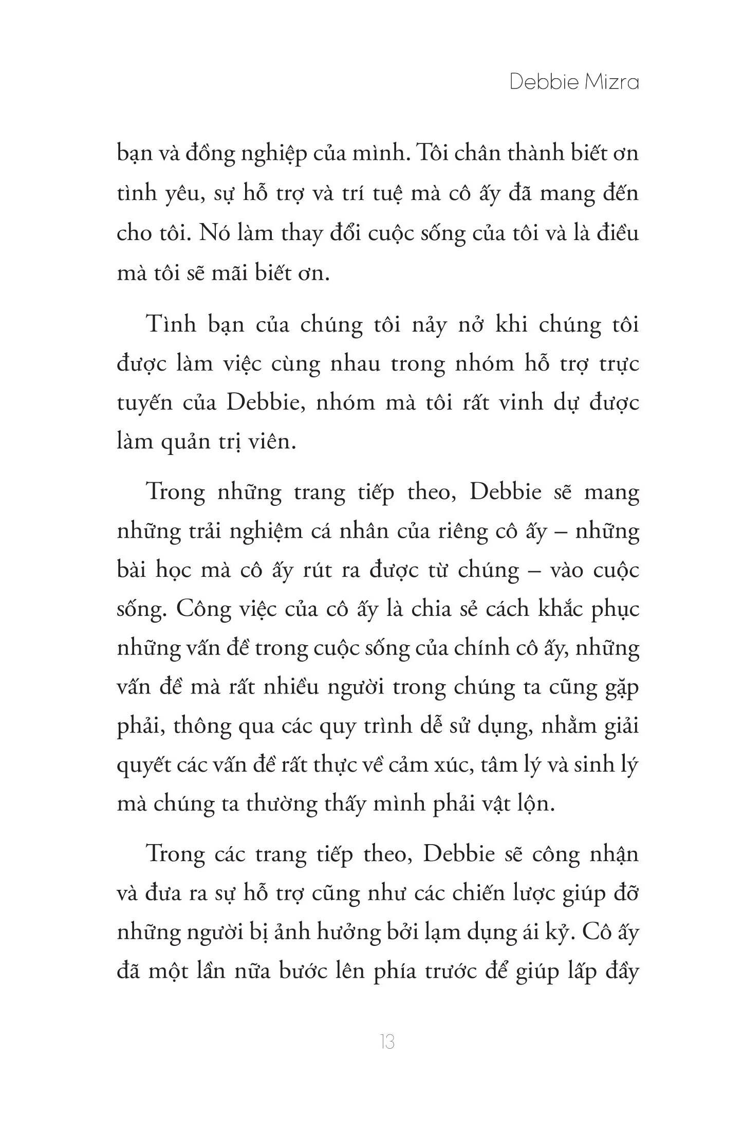 - Các bài tập giúp điều chỉnh hệ thống thần kinh của bạn sau nhiều năm bị tổn thương Những nhận xét về cuốn sách: Cuốn sách này sẽ giải đáp thỏa đáng những câu hỏi đầy dằn vặt sau: “Làm sao tôi lại để m.ình bị đối xử như vậy?” “Liệu tôi có bao giờ được trở lại là chính m.ình nữa không?” “Làm sao tôi biết nên tin ai?” -Abby Rodman, Nhà trị liệu tâm lý, người đồng dẫn chương trình podcast Sisters Cracking Up- Thông tin tác giả Debbie Mirza là huấn luyện viên phục hồi, tác giả và ca sĩ/nhạc sĩ. Trong quá trình huấn luyện của m.ình, cô đã có cơ hội làm việc trực tiếp với những người đã đang trong những mối quan hệ với những người ái kỷ bí mật. Chính vì thế, tác phẩm của cô tập trung giải thích đặc điểm của kiểu người ái kỷ quỷ quyệt nhất, từ đó xác định mức độ ảnh hưởng tiềm năng của chứng rối loạn này đến bạn và cách chữa lành nếu bạn vô tình rơi vào một mối quan hệ như thế