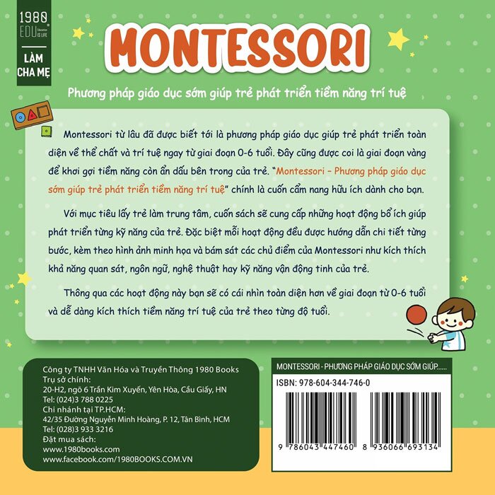 Cuốn sách “Montessori phương pháp giáo dục sớm giúp trẻ phát triển tiềm năng trí tuệ” chính là cuốn cẩm nang giúp các bậc cha mẹ tìm hiểu và sáng tạo những hoạt động bổ ích giúp khơi gợi và phát triển toàn diện khả năng tư duy logic, nhận biết, cũng như tăng cường các kỹ năng vận động tinh và thô của trẻ trong giai đoạn từ 0 tới 6 tuổi.