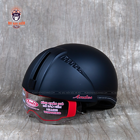 - Phong cách thiết kế: mũ kiểu 3/4 kèm kính dài, mũ được thiết kế dáng tròn, đi kèm 2 miếng ốp má, giúp tăng thêm hiệu quả bao phủ, bảo vệ khuôn mặt. -
