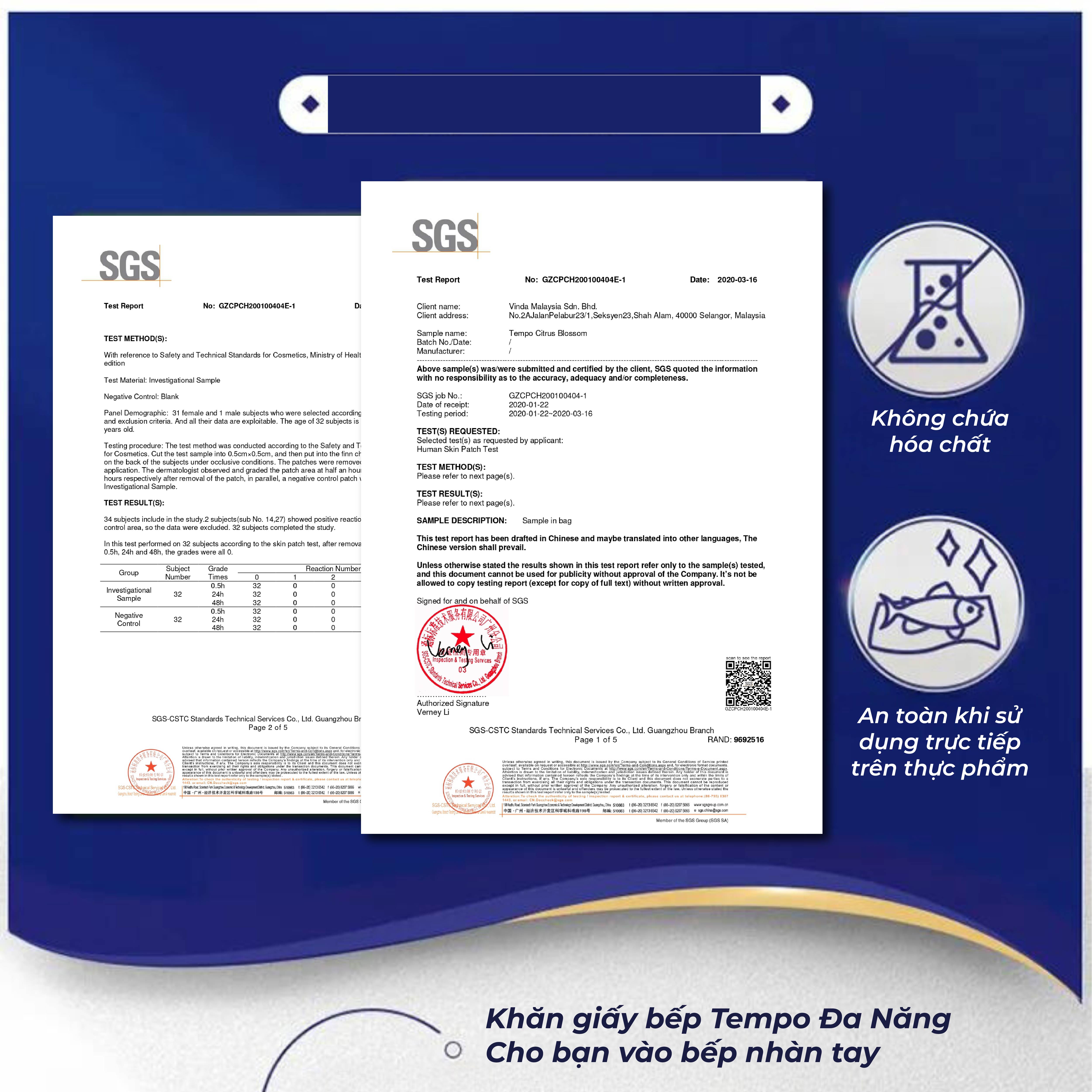 MUA 1 LỐC KHĂN GIẤY BẾP CUỘN TẶNG 1 GÓI KHĂN GIẤY BẾP DẠNG RÚT Khăn giấy bếp đa năng siêu thấm Tempo (4 Cuộn) Thương Hiệu Đức ** TEMPO là thương hiệu khăn giấy cao cấp của Đức từ năm 1929. Với chất lượng và công nghệ vượt trội, Tempo đang chiếm lĩnh vị trí số 1 tại thị trường Đức, Ý, Thụy Sỹ... Tempo là thương hiệu khăn giấy được yêu thích và tin dùng tại nhiều quốc gia trên thế giới, đặc biệt là Châu Âu và Châu Á. Được sản xuất theo công thức cải tiến mới và nguyên liệu tự nhiên đạt chuẩn Châu Âu, khăn giấy bếp đa năng siêu thấm Tempo đa năng, chất lượng giấy dày và bền dai hơn giúp thấm hút dầu thừa, nước vượt trội, tiện lợi dễ xé. *ĐẶC ĐIỂM NỔI BẬT: + Công nghệ Fabric Air thấm hút vượt trội, bền dai + Khăn giấy 3 lớp + Bền dai khi ướt + Đạt 5 giấy chứng nhận VSATTP: FDA, ISO, LFGB, EDQM, GB + Tiện lợi, vệ sinh , dễ xé + Hoa văn dập nổi tinh tế trên từng lớp giấy + 100% bột gỗ giấy nguyên sinh, không bụi giấy Khăn giấy bếp đa năng siêu thấm dạng gói với 3 lớp giấy cao cấp, không chứa chất độc hại, đặc biệt an toàn cho thực phẩm, mang đến bạn cảm giác thực sự yên tâm khi sử dụng. Với thiết kế dạng gói rút tiện lợi, khăn giấy bếp đa năng siêu thấm Tempo đa năng dễ dàng và phù hợp sử dụng cho các sinh hoạt hằng ngày. *THÀNH PHẦN NGUYÊN LIỆU: Được làm 100% từ bột gỗ giấy nguyên sinh. *Hướng dẫn sử dụng: Khăn giấy bếp đa năng siêu thấm dùng vệ sinh trong khu bếp và các sinh hoạt hằng ngày. *Hướng dẫn bảo quản: Để nơi thoáng mát và tránh ánh nắng mặt trời. *Cảnh báo an toàn sức khỏe: Không được ăn và tránh xa tầm tay trẻ em. *Quy cách đóng gói: Số lượng: 4 cuộn/ lốc. Số lớp: 3 lớp/ tờ. Định lượng của 1 lớp giấy: 20,0 ± 1,0 g/m2. Kích thước: (112 mm x 224 mm) ± 3%. *Ngày sản xuất: in trên gói theo năm/tháng/ngày. *Hạn sử dụng: 3 năm kể từ ngày sản xuất *Sản phẩm an toàn với các tiêu chuẩn: + FDA: Tuân thủ theo tiêu chuẩn Quản lý Thực phẩm và Dược phẩm Hoa Kỳ + ISO: Nhà máy tuân thủ hệ thống quản lý an toàn thực phẩm ISO 22000 + Không sử dụng chất làm trắng huỳnh quang #khangiay #khangiayrut #khangiaybich #khangiaykho #khangiaycaocap #khangiaybichcaocap #khangiaytempo #khangiaytempocaocap #khangiayTempoSoftPack #giaytempo #khangiayruttempo #tempo #khangiay4lop #khangiayantoanchoda #khangiaylau #khangiaythuonghieuduc #khangiaynhapkhau #khangiaythom #giayan #giaybep #giaydanang