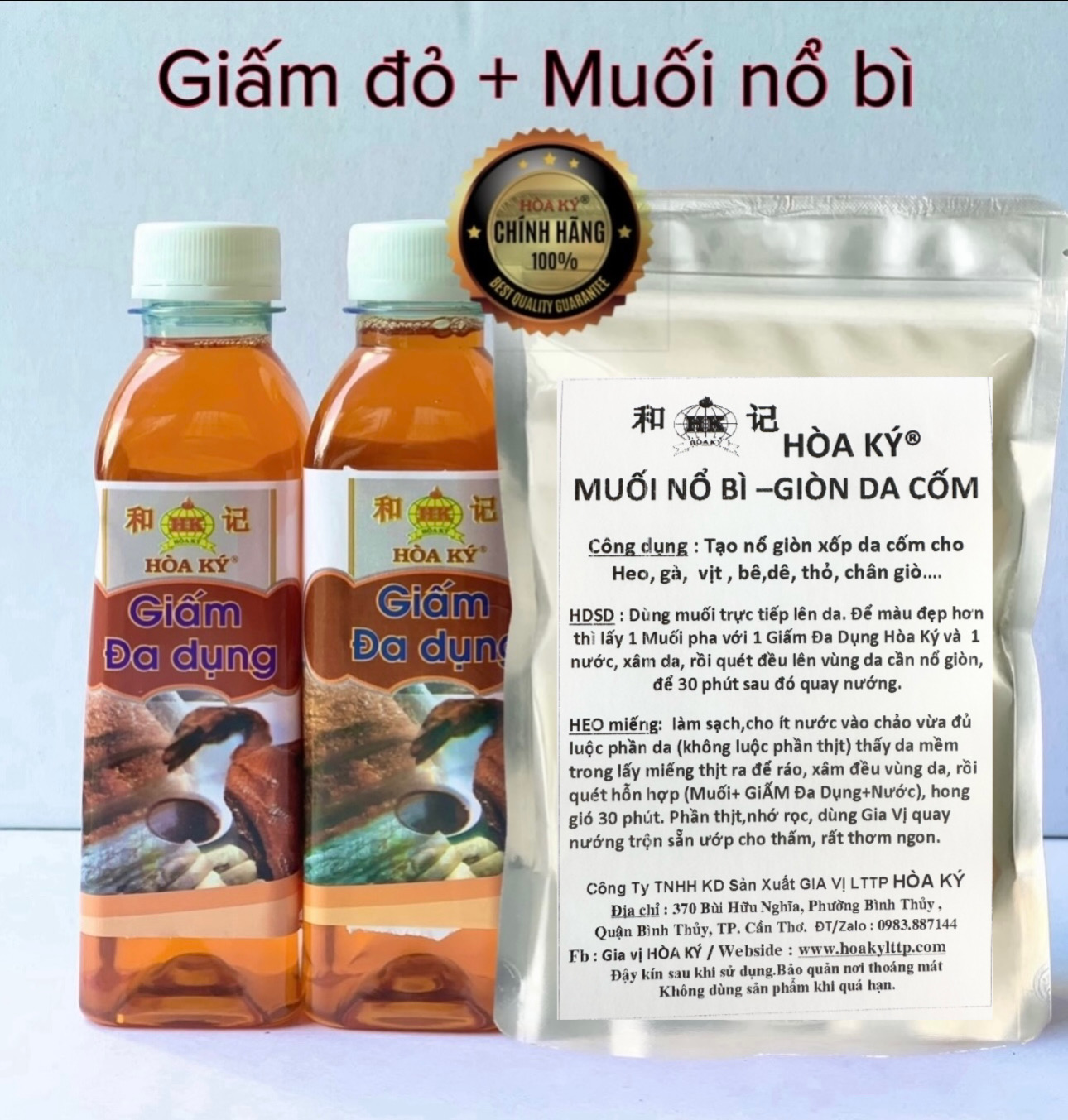 Combo quay nướng đầy đủ gia vị, không cần nêm thêm. Gồm có : Muối nổ bì giòn da cốm Gia vị trộn sẵn ướp phần thịt Giấm (Dấm) đa dụng tạo màu đẹp ,da giòn . Thực phẩm : cho Heo, gà,  vịt , bê,dê, thỏ, chân giò, chim bồ câu ….tạo nổ giòn xốp da cốm, thịt thấm vừa ăn thơm ngon.   MUỐI NỔ BÌ - GIÒN DA CỐM   Công dụng : Tạo nổ giòn xốp da cốm cho Heo, gà,  vịt , bê,dê, thỏ, chân giò.... HDSD : Dùng muối trực tiếp lên da. Để màu đẹp hơn thì lấy  Muối nổ pha với  Giấm Đa Dụng Hòa Ký , xâm đều bề mặt da, rồi quét đều vùng da cần nổ giòn, để 30phút – 1 tiếng ( tùy miếng thịt nhỏ lớn), sau đó quay nướng. Lưu Ý : Tùy kích thước miếng thịt mà chúng ta chọn nhiệt độ lò và thời gian quay cho phù hợp .   HEO miếng:  làm sạch,cho ít nước vào chảo vừa đủ luộc phần da (không luộc phần thịt) thấy da mềm trong,  lấy miếng thịt ra để ráo, xâm đều vùng da, rồi quét hỗn hợp (Muối nổ + GiẤM Đa Dụng), hong gió 30 phút – 1 tiếng. Phần thịt,nhớ rọc, dùng Gia Vị quay nướng trộn sẵn ướp cho thấm, rất thơm ngon.   Dùng gia vị ít hay nhiều đều được ( tuỳ khẩu vị) . Dùng được cho món Chay.