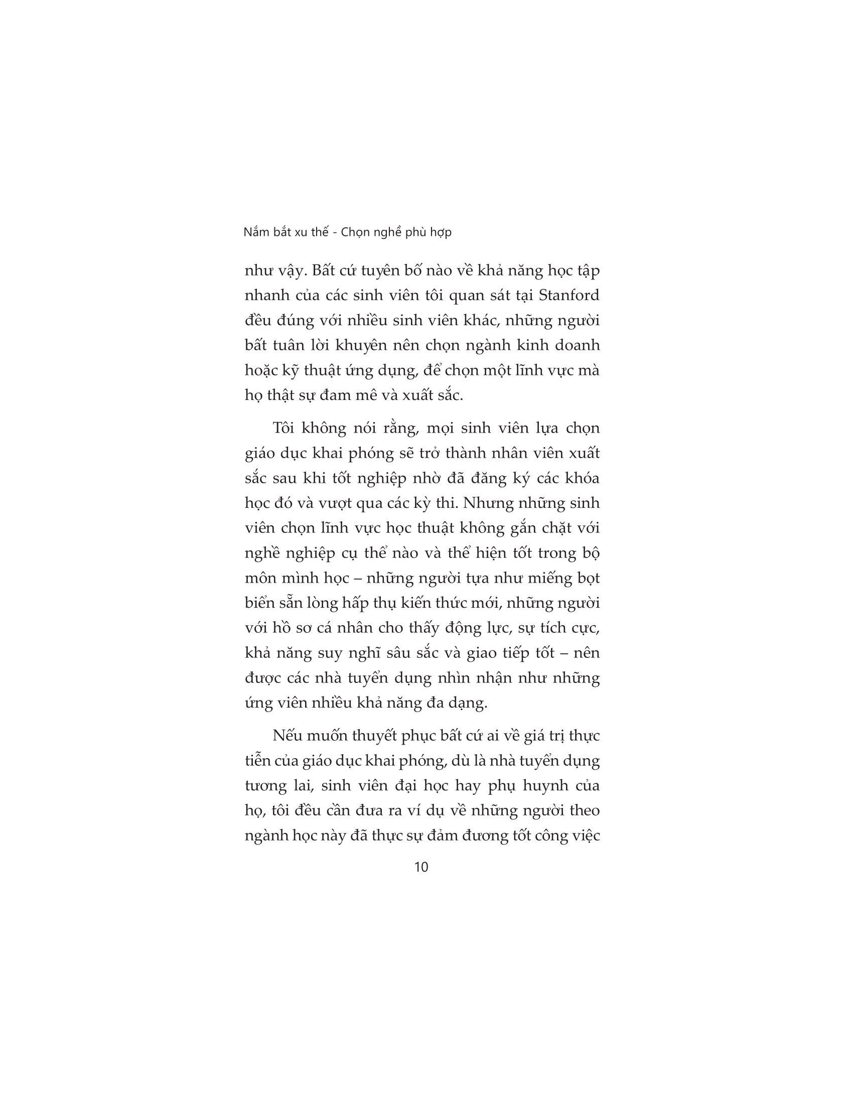 Nắm Bắt Xu Thế - Chọn Nghề Phù Hợp Định hướng nghề nghiệp, rèn luyện tư duy và kỷ luật bản thân để đón đầu cơ hội phát triển Lựa chọn nghề nghiệp là một trong những quyết định quan trọng thay đổi cả cuộc đời. Việc làm không chỉ để nuôi sống bạn mà còn mang đến cho bạn cuộc sống chủ động với các mối quan hệ thân thiện xung quanh. Mặc dù “biết phải làm gì” nhưng không phải ai trong chúng ta cũng “biết làm thế nào”. Nếu đang mông lung trong suy nghĩ ấy, cuốn sách “Nắm bắt xu thế- Chọn nghề phù hợp” sẽ là một trợ lý đắc lực dành cho bạn. Bất kể ngành học mà bạn muốn hoặc đang theo đuổi là gì, nếu như bạn cảm thấy hoang mang về cuộc sống hậu đại học và muốn trang bị cho bản thân những kỹ năng nghề nghiệp tốt nhất ngay từ bây giờ, hãy bắt đầu bằng cách đọc Nắm bắt xu thế - Chọn nghề phù hợp. Những câu chuyện thực tiễn trong cuốn sách này sẽ cung cấp những lời khuyên và giúp bạn tự rút ra những điều cần làm, ví dụ như tham gia các kỳ thực tập ngay từ năm hai hay xây dựng mạng lưới quan hệ với các cựu sinh viên. Bạn sẽ vừa có thể theo đuổi đam mê tri thức, vừa tích lũy được những kỹ năng mềm và kỹ năng chuyên môn thiết thực để sẵn sàng đối mặt với tương lai bất định. Về tác giả Randall Stross là một nhà sử học chuyên viết về các đề tài công nghệ, kinh doanh và xã hội hiện đại. Ông từng viết bài cho New York Times, The New Republic, US News & World Report và Fortune.