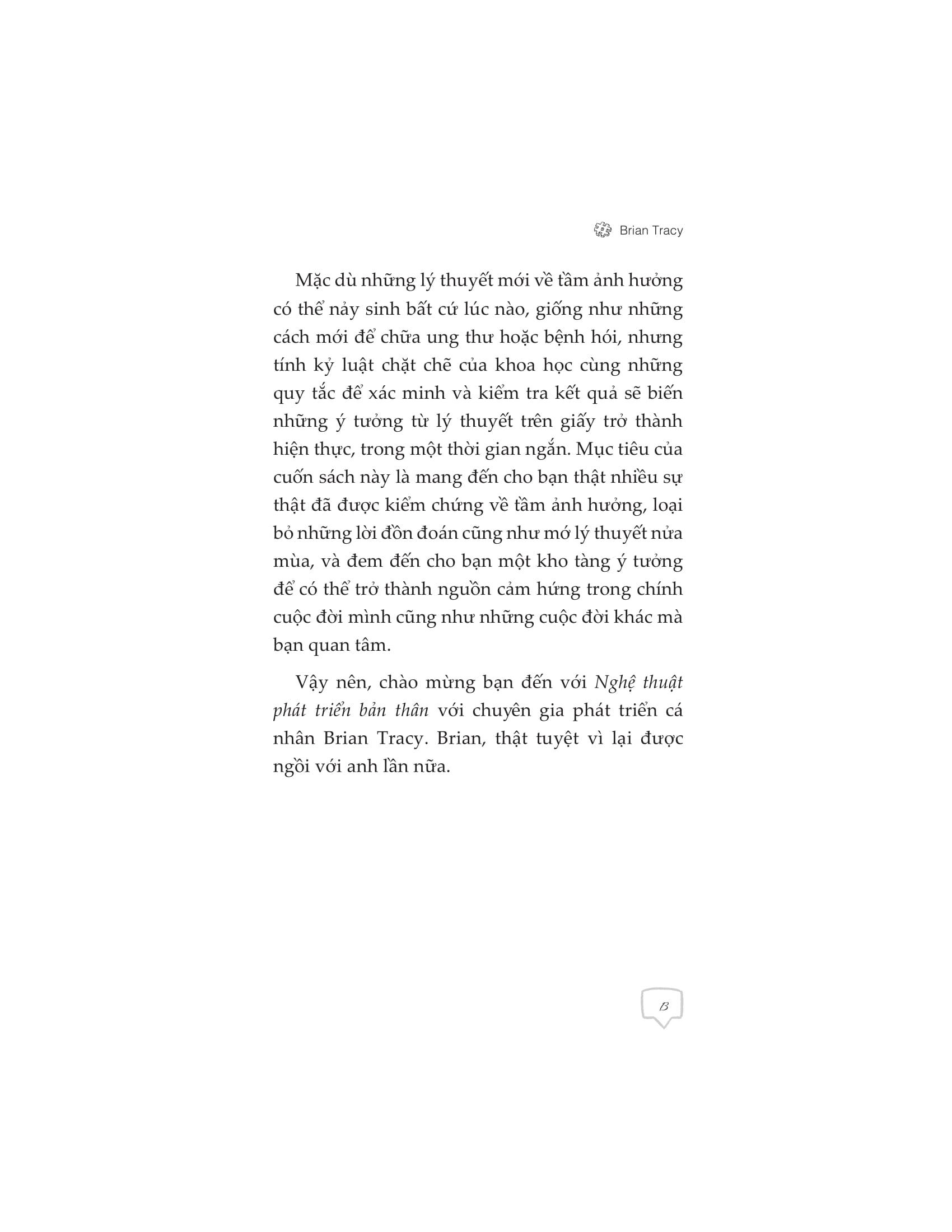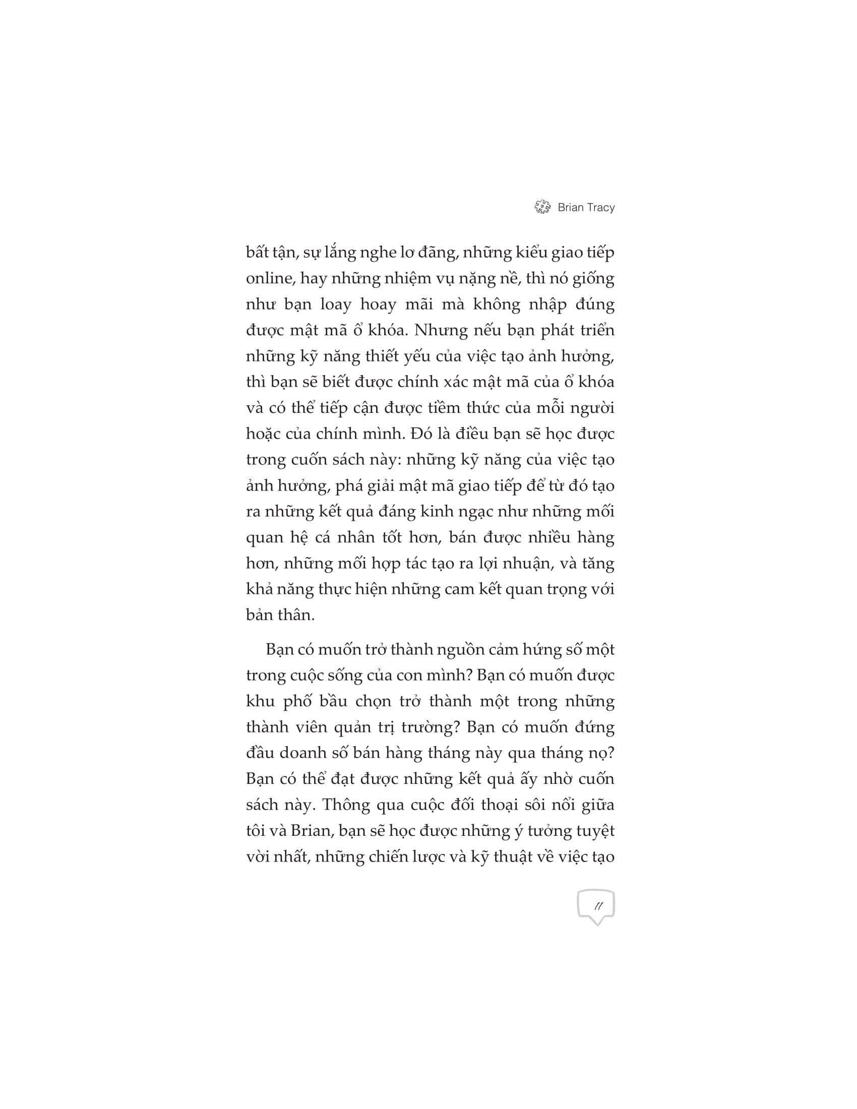 Để có tầm ảnh hưởng với mọi người và phát triển bản thân, bạn cần phải làm những việc mang tính logic cụ thể. Nếu bạn thực hiện đúng, mọi người sẽ cởi mở hơn với sự ảnh hưởng từ phía bạn, họ sẽ muốn được bạn truyền cảm hứng, họ sẽ tìm đến sự dẫn dắt cũng như định hướng của bạn. Họ sẽ có năng suất cao hơn hẳn những gì bạn từng kì vọng, và bạn sẽ có được kết quả vượt xa những gì bạn từng được nhận trước đây.