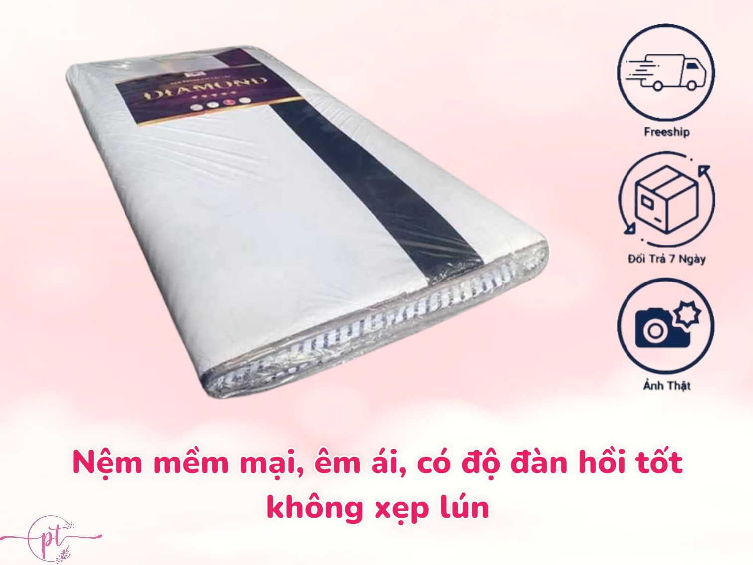 - Nệm Pe Hàn Quốc là sản phẩm ổn định về chất lượng, bề mặt nệm chắc chắn, không bị xẹp lún theo thời gian. Nệm có độ phẳng cao, nâng đỡ cơ thể, giúp sự