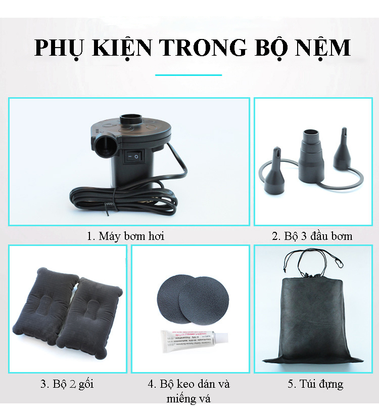 Phụ kiện đi kèm: Bơm điện 12v, 3 đầu bơm, 2 vỏ gối, túi & 1 bộ keo vá dự phòng.