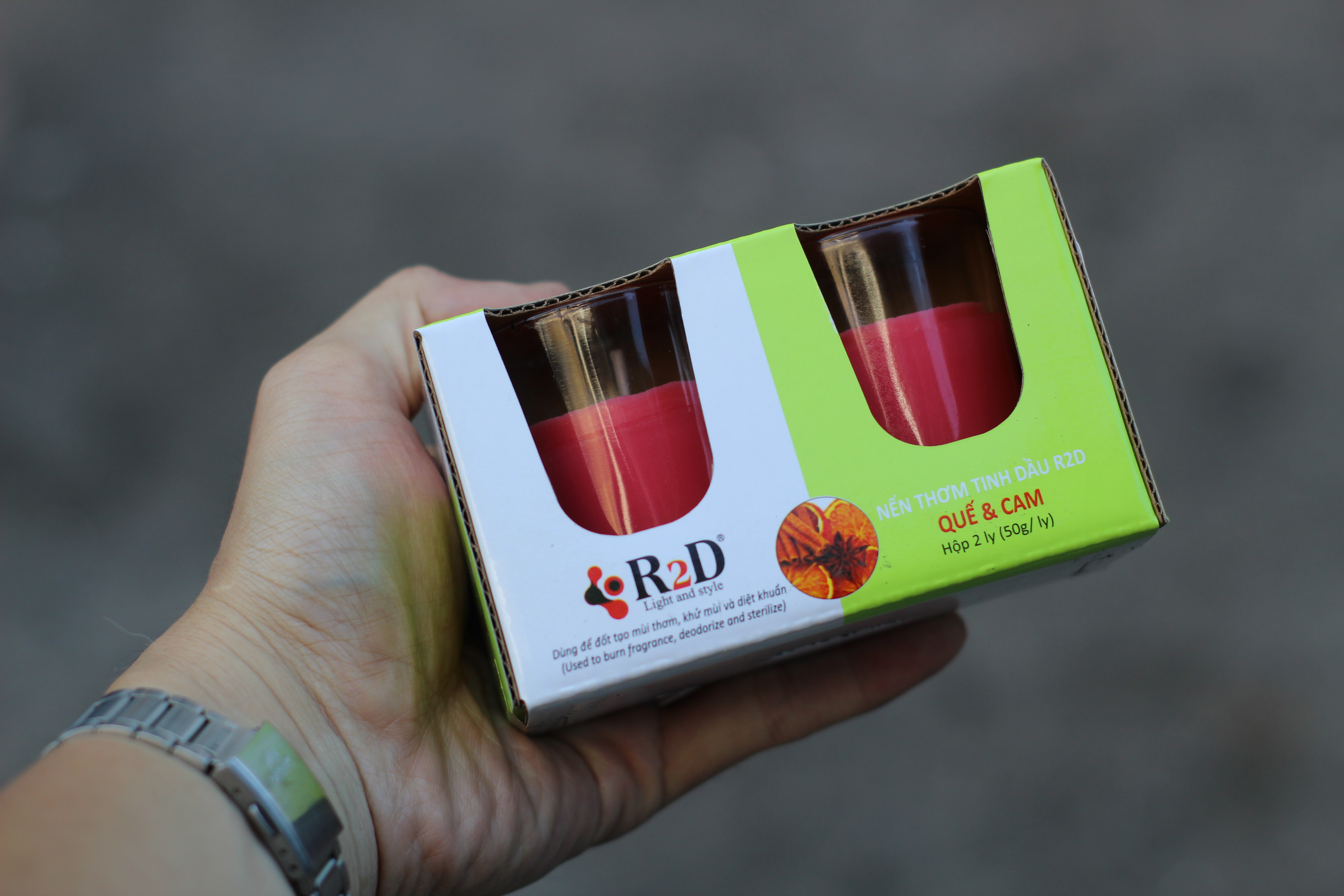 Mua tại TiktokNến Thơm, Tinh Dầu Quế Cam, [Ly 50g-Hộp 2 ly], Chính Hãng Từ Shop R2D, Thành Phần Tự Nhiên, Lành Tính. - Tất cả chúng ta đều cảm thấy thoải mái khi không gian xung quanh có một hương thơm tuyệt vời, chúng có thể giúp thay đổi tâm trạng và ngày cả ở cường độ mùi rất nhẹ cũng mang lại một môi trường dễ chịu và giúp ngủ ngon hơn. - Tuy nhiên, việc lựa chọn các sản phẩm mùi hương nào cũng được nhiều người quan tâm. Nến thơm là hình thức khuếch tán mùi hương được nhiều người yêu thích. -Nến Thơm Tinh Dầu Quế Cam là sự kết hợp giữa Cam và Quế đã tạo ra một hương thơm độc đáo, một chút nồng ấm của quế, một chút thanh mát, ngọt ngào của cam, khi đốt tạo mùi hương dễ chịu, ngoài công dụng khử mùi, làm sạch không khí và tạo cảm giác thư giãn, tinh dầu QUẾ CAM còn đồng thời kích thích hệ miễn dịch và mang lại cảm giác ngủ ngon hơn. - Nếu bạn đang tìm một hương thơm không quá nồng, cùng sự thanh mát của vị cam để tạo nên dấu ấn riêng cho bản thân, thì hãy sử dụng sáp thơm tinh dầu quế cam nha. - Sản phẩm được làm từ nguyên liệu tự nhiên như dầu dừa, dầu cọ, dầu đậu nành và tinh dầu quế cam tinh chất. Sản phẩm an toàn, thân thiện với môi trường, không có khói khi đốt và có thể đốt liên tục 8h, hoặc bạn có thể sử dụng và tắt nến sau khi căn phòng đã tràn ngập mùi thơm quế cam. Định lượng: 50g. Kích thước: 11.5x5.5x6.5 cm Thời gian đốt: 8 giờ trong điều kiện phù hợp. Thành phần: Dầu cọ, dầu dừa, tinh dầu quế, cam. HƯỚNG DẪN SỬ DỤNG: