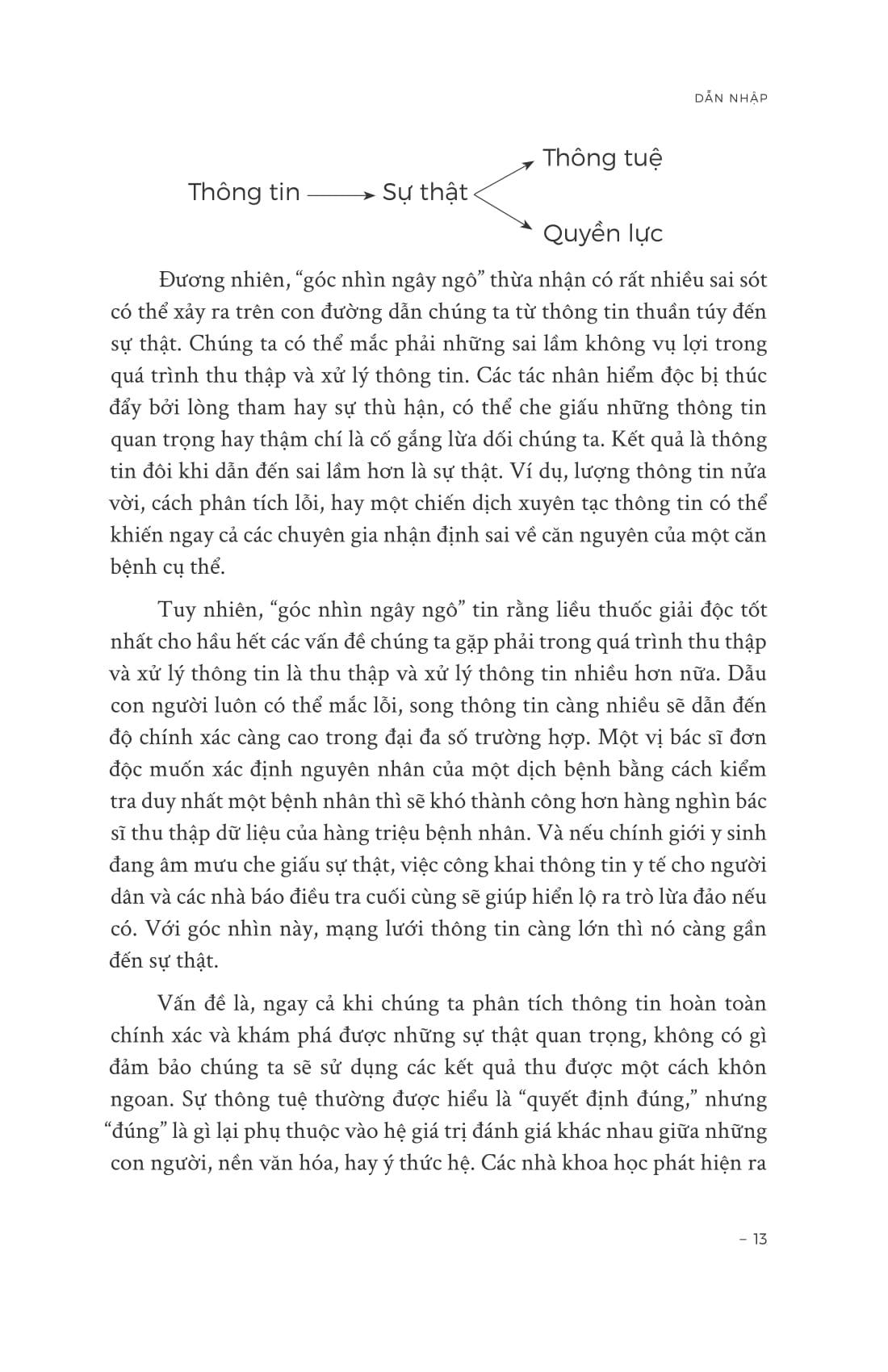 “Tầm quan trọng của những câu chuyện tiết lộ điều cơ bản về sức mạnh của loài người chúng ta, và nó cũng lý giải vì sao sức mạnh không phải lúc nào cũng đi đôi với sự khôn ngoan. Góc nhìn ngây ngô về thông tin nói rằng thông tin dẫn đến sự thật, và biết sự thật giúp mọi người đạt được cả quyền năng lẫn sự thông tuệ. Nghe có vẻ thật vững vàng. Nó ngụ ý rằng những kẻ phớt lờ sự thật sẽ khó mà đạt uy quyền, trong khi những người tôn trọng sự thật luôn có thể, và uy quyền của những người tôn trọng sự thật thì lại đã được trui rèn nhờ sự thông tuệ. Niềm tin này giả dụ rằng những kẻ khinh thị sự thật về sinh học của con người có thể là những kẻ phân biệt c.hủng tộc nhưng lại không đủ khả năng sản xuất các loại thuốc có tầm ảnh hưởng hay chế tạo các loại v.ũ khí sinh học tàn ác, trong khi những người hiểu biết về sinh học sẽ có năng lực sản xuất các sản phẩm nói trên nhưng họ lại không sử dụng chúng để phục vụ các hệ tư tưởng phân biệt c.hủng tộc. Nếu đó là sự thật, chúng ta có thể ngủ một giấc thật sâu, tin rằng các vị tổng thống, giáo chủ, và CEO sẽ luôn minh triết, chân thành. Một chính trị gia, một phong trào, hoặc một đất nước có thể vượt trội ở đâu đó với sự giúp đỡ của những lời nói dối và sự lọc lừa, nhưng về lâu dài nó cũng chỉ là một chiến lược khéo quá hóa vụng mà thôi.”
