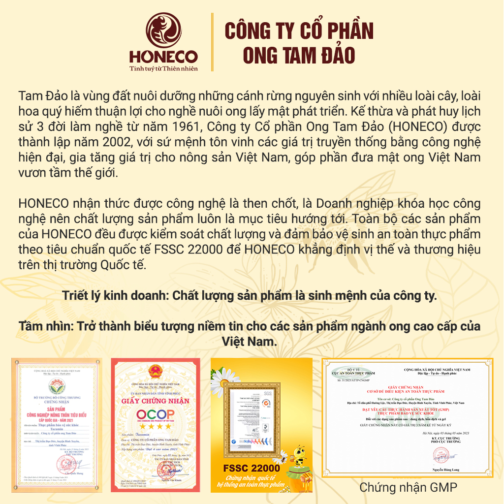 Với hệ thống nhà xưởng đạt chuẩn vệ sinh an toàn thực phẩm FSSC, ứng dụng công nghệ chế biến tiên tiến, đảm bảo thành phần các chất quý có trong mật ong và curcumin được giữ nguyên, ổn định về chất lượng.