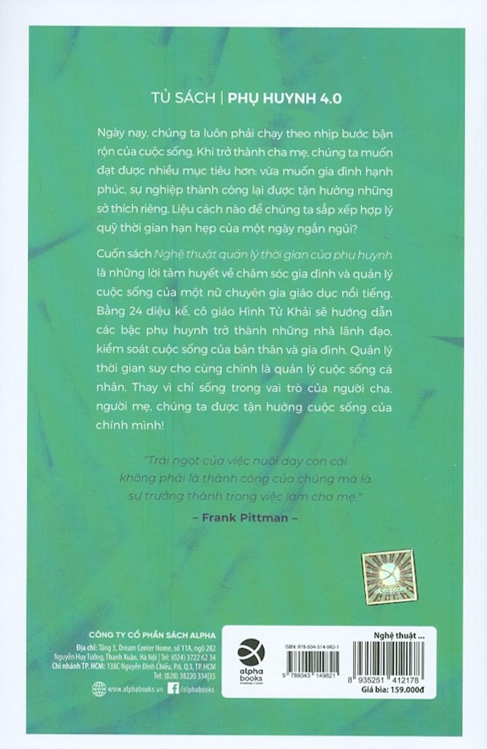 Quản lý thời gian là quản lý cảm xúc, năng lượng, là quản lý cuộc sống, cuộc đời của mình với những công việc khi có thêm một sinh linh mới khiến ta trở thành cha mẹ. Cuốn Nghệ thuật quản lý thời gian của cha mẹ sẽ giúp chúng ta hiểu thêm về nghệ thuật làm cha mẹ, nghệ thuật sống, và nhiều triết lý nhân sinh sâu sắc. Làm cha mẹ là sống thêm một cuộc đời nữa, một lần trẻ thơ nữa và là cách những người có mong muốn làm cha mẹ trưởng thành thêm khi có con.