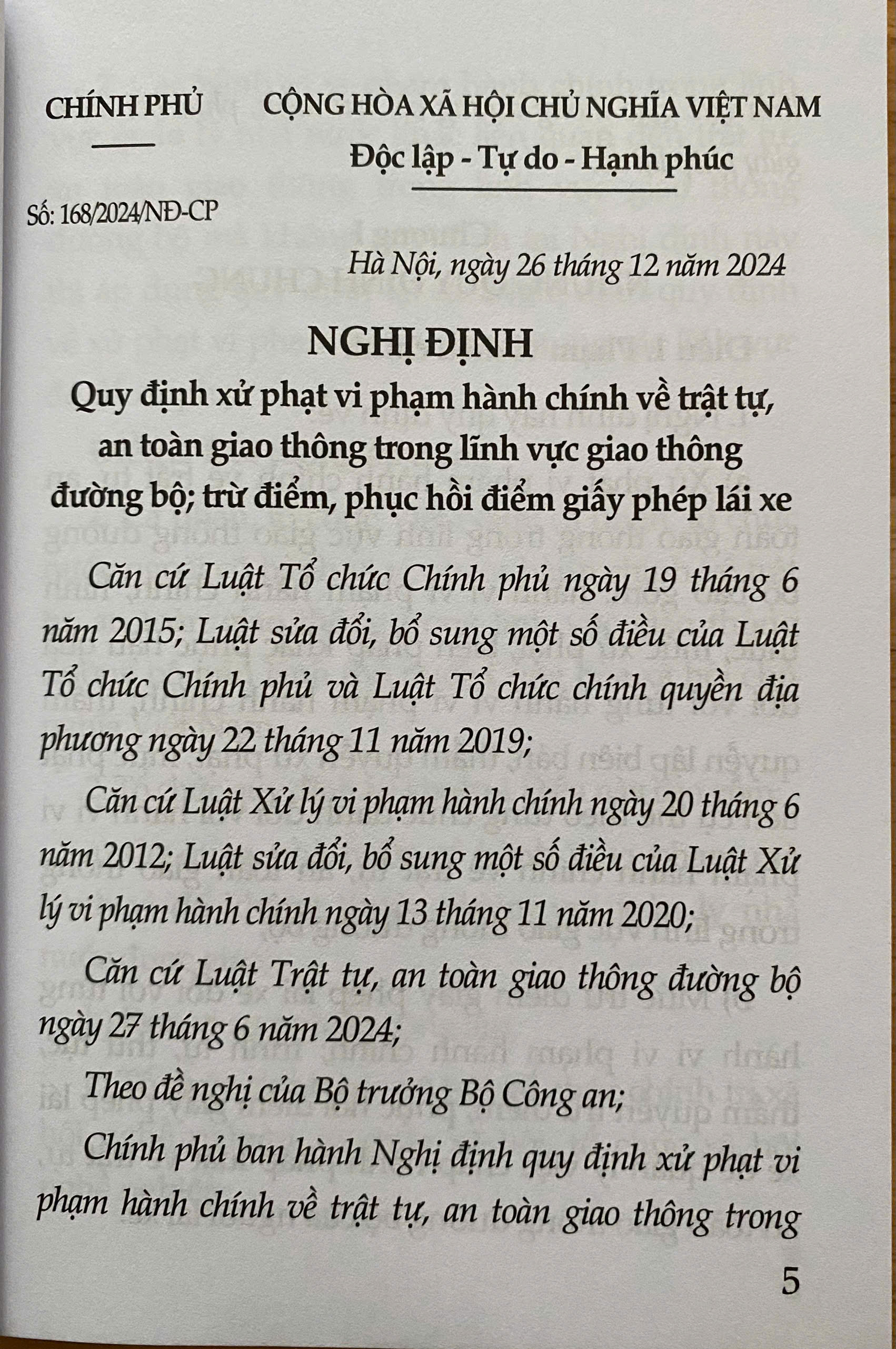 ✨Nghị định 168/2024/NĐ-CP ngày 26-12-2024 của Chính Phủ Quy Định Xử Phạt Vi Phạm Hành Chính Về Trật Tự, An Toàn Giao Thông Trong Lĩnh Vực Giao Thông Đường Bộ; Trừ Điểm, Phục Hồi Điểm Giấy Phép Lái Xe