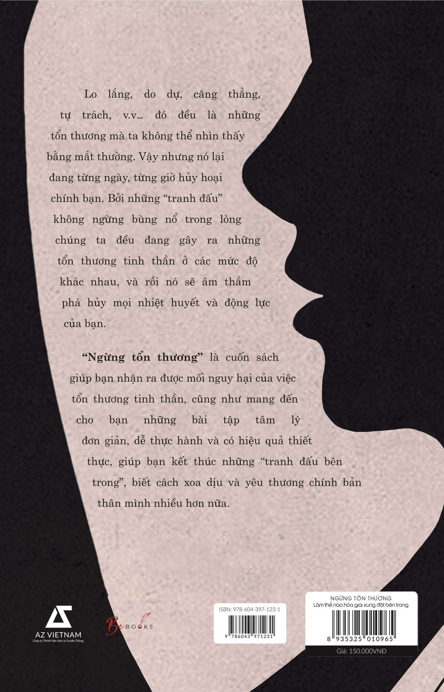 - Càng trốn tránh bạn sẽ càng tạo ra nhiều vết thương mới và xoáy sâu vào những vết thương cũ. Chính sự lo lắng, căng thẳng, tự trách… ấy sẽ giống như con sâu gặm nhấm tâm hồn, bào mòn tự tôn, ức chế tinh thần và ảnh hưởng tiêu cực đến tất cả mối quan hệ của bạn. Với cường độ cao, nó còn có thể gây ra những tổn thương lớn về tâm lý như trầm cảm hoặc tự hủy hoại bản thân. Vậy làm cách nào để giải quyết những cảm xúc đó? Cuốn sách “Ngừng tổn thương - Làm thế nào hóa giải những xung đột bên trong” không chỉ giúp bạn soi tỏ nguồn cơn của những nỗi đau mà còn hướng dẫn bạn từng bước chấp nhận và gỡ bỏ chúng ra khỏi cuộc đời mình. Bằng 10 năm nghiên cứu và làm việc trong ngành Tâm lý, tác giả Vu Đức Chí đã chỉ ra những liệu pháp cực kỳ đơn giản, hiệu quả để tránh xa những cảm xúc tiêu cực như: cách khắc phục tâm lý “tôi biết nhưng tôi không làm được”, kỹ năng để xử lý tư duy “nhai lại” hay nên làm gì khi không được thấu hiểu… Bí mật của một cuộc sống trọn vẹn chính là một tâm trí an lành bên trong một cơ thể khỏe mạnh. Hy vọng cuốn sách sẽ trở thành điểm tựa tinh thần cho những ai đang lạc lối trên con đường phát triển bản thân.