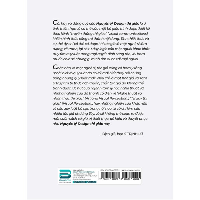 Nguyên Lý Design Thị Giác (Bìa Cứng) Kể từ khi con người biết làm ra công cụ thì design đã là vật chứng của văn minh nhân loại. Lịch sử design là lịch sử văn minh con người, đồng thời là văn hóa thị giác. Design có mối quan hệ song sinh, liên tục, không gián đoạn với mọi loại hình nghệ thuật thị giác thực và ảo. Trên cơ sở đó, Nguyên lý Design thị giác đề cập tới mối quan hệ giữa thị giác với ánh sáng, hình thể, màu sắc... là bước đầu nền tảng chuẩn bị cho sáng tạo của các nhà design tương lai, cho thao tác tìm kiếm những khác biệt của nhận thức cái đẹp. Đây không những là một giáo trình xuất sắc mà còn là cẩm nang cần thiết cho người làm thiết kế mỹ thuật, họa sĩ, nhà thẩm định và phê bình trong lĩnh vực nghệ thuật thị giác nói chung - cả tự học lẫn sinh viên, chuyên và không chuyên. Theo lời dịch giả, họa sĩ Trịnh Lữ, cái hay, cái đáng quý của "Nguyên lý Design thị giác" là ở tính thiết thực và cụ thể của một bộ giáo trình được thiết kế theo kênh “truyền thông thị giác”, khiến hình thức cũng trở thành nội dung. Tính thiết thực và cụ thể ấy chỉ có thể có được khi tác giả là một nghệ sĩ làm tượng, vẽ tranh, lại có tư duy logic của một người khao khát truy tìm quy luật trong mọi quyết định sáng tác, ham muốn chia sẻ những điều mình tìm được với mọi người. Với tâm niệm “phải biết rõ quy luật đã có rồi mới biết thay đổi chúng bằng những quy luật mới”, tác giả đã soạn ra một cuốn sách có giá trị thiết thực, có sức thuyết phục và vô cùng dễ hiểu.