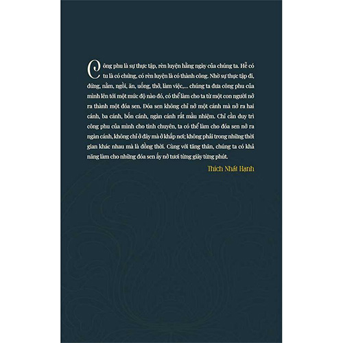 “Công phu là sự thực tập, là sự rèn luyện hằng ngày của chúng ta. Hễ có tu là có chứng, có rèn luyện là có thành công. Nhờ sự thực tập đi, đứng, nằm, ngồi, ăn, uống, thở, làm việc,… chúng ta đưa công phu của mình lên tới một mức độ nào đó, có thể làm cho ta từ một con người nở ra thành một đóa sen. Đóa sen không chỉ nở một cánh mà nở ra hai cánh, ba cánh, bốn cánh, ngàn cánh rất mầu nhiệm. Chỉ cần duy trì công phu của mình cho tinh chuyên, ta có thể làm cho đóa sen nở ra ngàn cánh, không chỉ ở đây mà ở khắp nơi; không phải trong những thời gian khác nhau mà là đồng thời. Cùng với tăng thân, chúng ta có khả năng làm cho những đóa sen ấy nở tươi từng giây từng phút.” (Thích Nhất Hạnh)