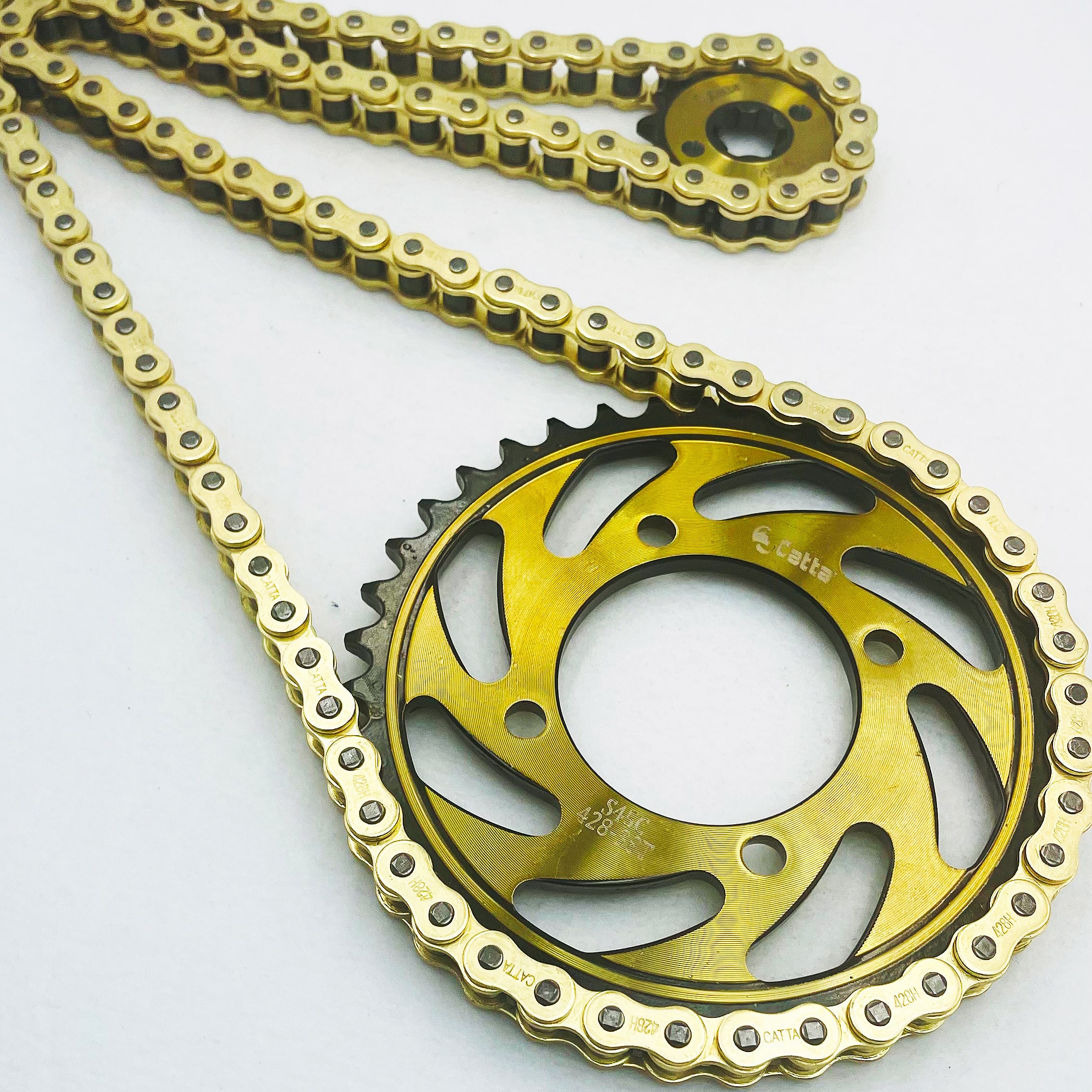 Ngoài ra, dĩa còn được phủ mạ vàng chống gỉ sét nên sản phẩm bền hơn và tuổi thọ cao hơn những sản phẩm tương tự nhưng không được mạ phủ bề mặt. Sên (xích) CATTA được gia nhiệt nhiều tầng giúp sên có độ bền cao, chịu tải tốt, lâu dãn (đa số các sản phẩm sên trên thị trường chưa được gia nhiệt đến tầng cao nhất).
