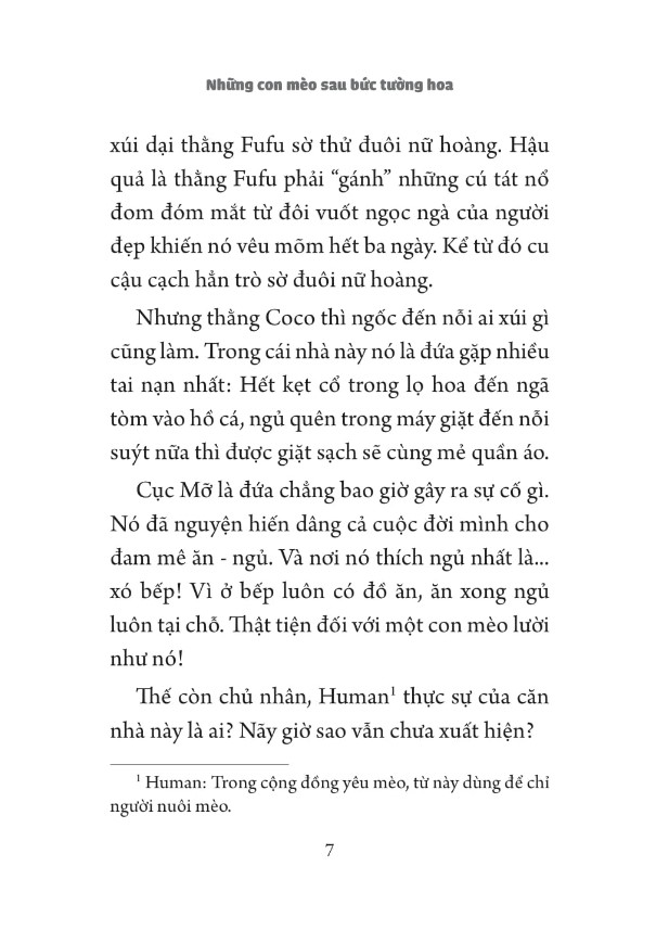 Những con mèo sau bức tường hoa,truyện thiếu nhi lọt vào vòng chung khảo giải thưởng Dế mèn, là câu chuyện về một gia đình nhỏ nằm sau bức tường hoa huỳnh vàng. Trong căn nhà ấy có đôi vợ chồng trung niên sống cùng sáu chú mèo: Sasa, Lulu, Fufu, Tom, Cục Mỡ, và Coco.