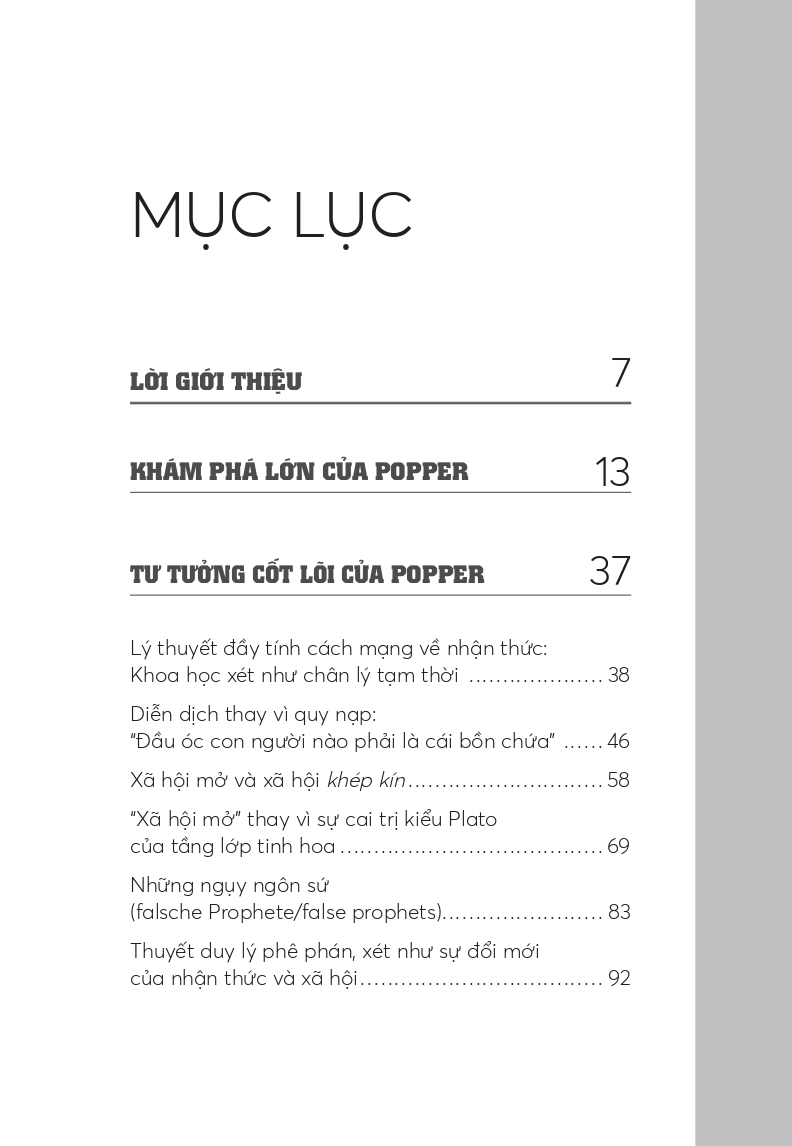 - Giới thiệu Những Nhà Tư Tưởng Lớn - Popper In 60 Minuten - Popper Trong 60 Phút Popper nêu ra lý tưởng về khoa học của “xã hội mở“: Mọi lý thuyết khoa học đều chỉ có giá trị hiệu lực cho đến khi nó bị phản bác bởi một ví dụ phản chứng hoặc bị thay thế bởi một lý thuyết chính xác hơn. Xã hội phải luôn luôn cởi mở đối với việc phê phán và đổi mới nhận thức của chúng ta Phương pháp thử và sai in dấu ấn lên sự tiến hóa. Từ muôn thuở, thực vật và động vật tối ưu hóa cơ may sống còn bằng những đột biến thất bại và thành công: Khoảng cách từ trùng a-míp đến Einstein chỉ là một bước. Triết học cho mọi người! Bộ sách Những nhà tư tưởng lớn lần đầu tiên trình bày sâu sắc công trình của các nhà triết học quan trọng nhất: Dễ hiểu, thú vị và rất thời sự.” – Martin Politowski “Tất cả đều được trình bày hết sức rành mạch: Phê phán của Popper đối với mọi chủ nghĩa toàn trị, yêu sách về xã hội mở, sự khích lệ những bước đi táo bạo trong khoa học và chính trị. Một gợi ý quan trọng trong thế giới đang tự mãn với chủ nghĩa tiêu thụ và lúng túng trong chính trị.”