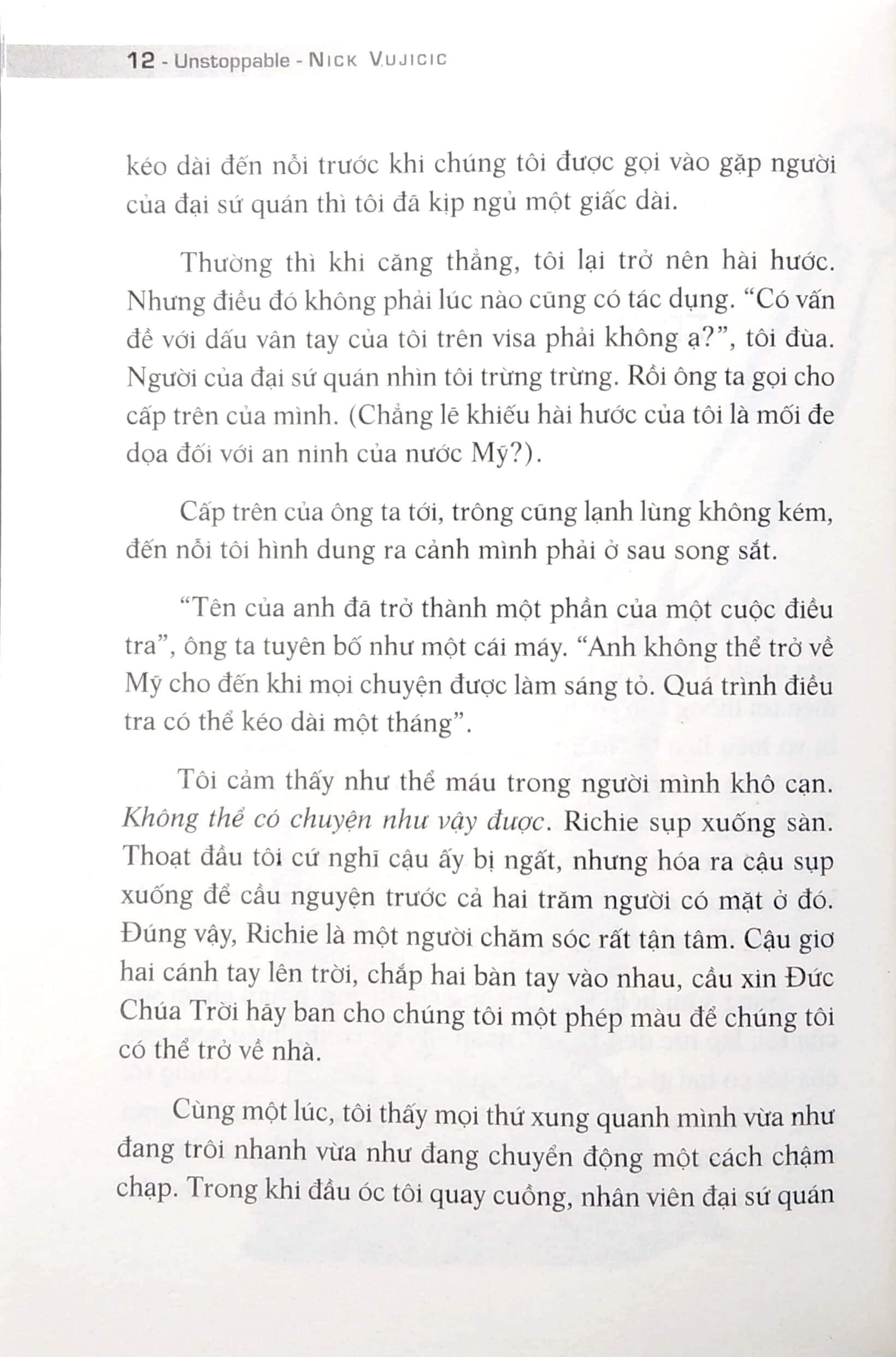 Làm cách nào để vượt qua sự chế giễu, bắt nạt và cô độc? Từng có lúc tuyệt vọng đến mức muốn từ bỏ cuộc sống, nhưng Nick đã lựa chọn đứng lên. Anh biến nghịch cảnh thành sức mạnh, biến sự khác biệt thành nguồn cảm hứng. Từ đó, anh trở thành một diễn giả truyền cảm hứng toàn cầu, lan tỏa thông điệp về niềm tin và khát vọng sống. Những câu chuyện và bài học thực tiễn Trong Đừng Bao Giờ Từ Bỏ Khát Vọng – Unstoppable, Nick không chỉ kể lại hành trình của mình mà còn chia sẻ: