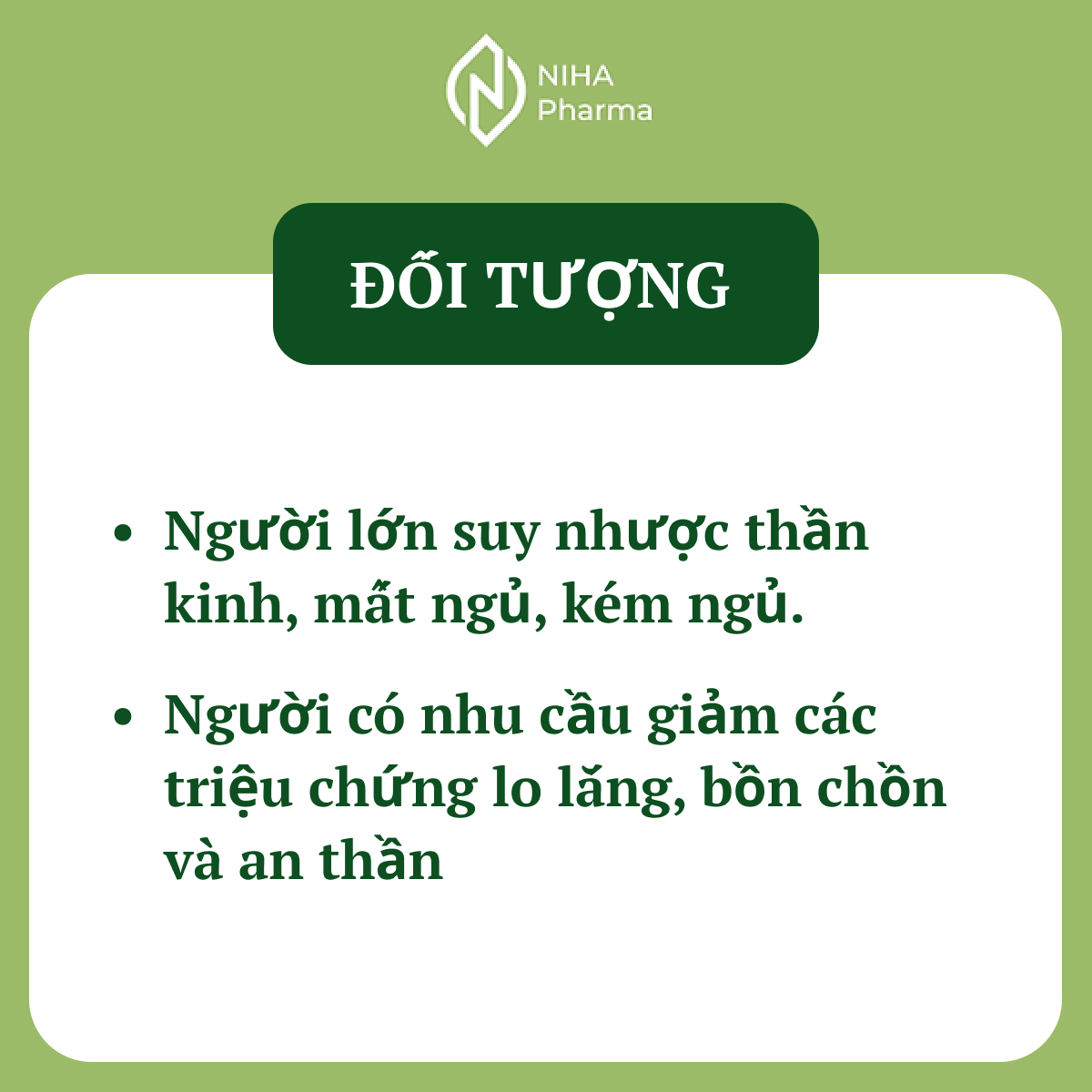Trong 1 viên nang cứng có chứa: Chiết xuất vông nem (Erythrina orientalis): 100mg. Chiết xuất lạc tiên (Passiflora foetida): 65mg. Chiết xuất củ bình vôi (Stephania rotunda): 60mg. Chiết xuất tâm sen (Nelumbo nucifera): 50mg. Chiết xuất cây ban âu (Hypericum perforatum): 50mg. Chiết xuất hoa bia (Humulus lupulus): 50mg. Chiết xuất Cúc la mã (Anthemis nobilis): 45mg. GABA (Gamma aminobutyric acid): 10mg. Melatonin: 2mg.
