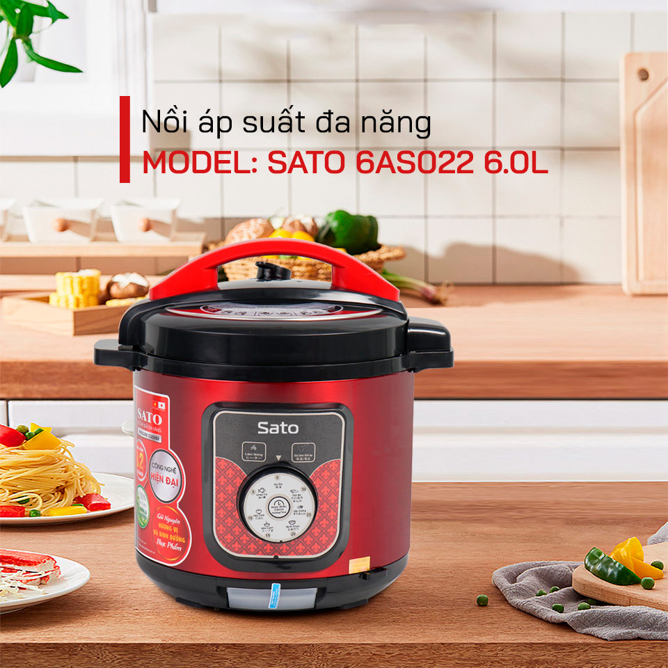 Mua tại TiktokĐặc điểm nổi bật Nồi áp suất đa chức năng : nấu cơm, nấu cháo, hầm gân, ninh, súp, hấp, giữ ấm ... Dung tích : 6.0 lít phù hợp gia đình 4 - 6 người. Lòng nồi bằng hợp kim nhôm chống dính cao cấp, an toàn sức khỏe. Bảng điều khiển Tiếng Việt dễ hiểu, dễ thao tác, an toàn khi dùng với van xả áp, van khóa hiện đại. Thiết kế sang trọng, hiện đại màu sắc nổi bật. Công nghệ Nhật Bản - Sản xuất tại Việt Nam! Sản phẩm đa năng giúp nấu nhiều món ăn ngon mà không cần chuẩn bị nhiều dụng cụ nấu, tiết kiệm điện năng và thời gian chế biến. Nồi áp suất đa năng Sato 6AS029 sở hữu các ưu điểm vượt trội như: