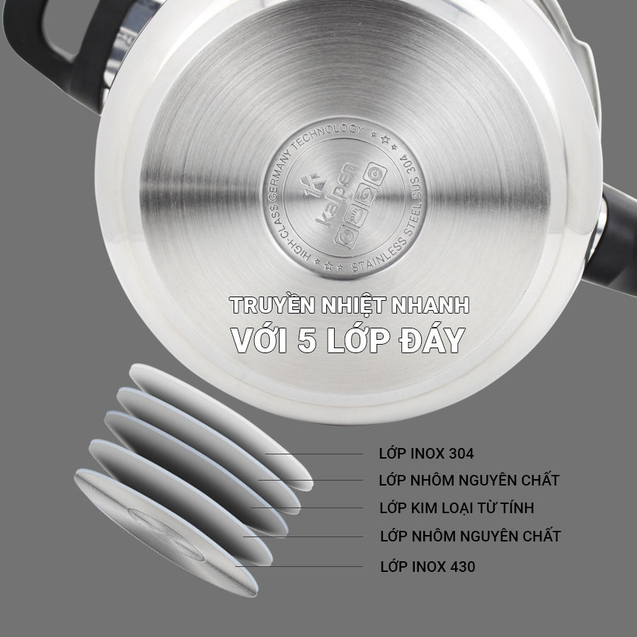 • Cấu trúc đấy 5 lớp Nồi áp suất inox Kalpen P2, 6L với cấu trúc đáy 5 lớp cùng với bề dày thân nồi 1mm giúp nồi hút nhiệt mạnh, giữ nhiệt lâu, truyền nhiệt đều và nhanh giúp cho các món ăn chín mềm, đều và giữ được hương vị tươi ngon trọn vẹn.