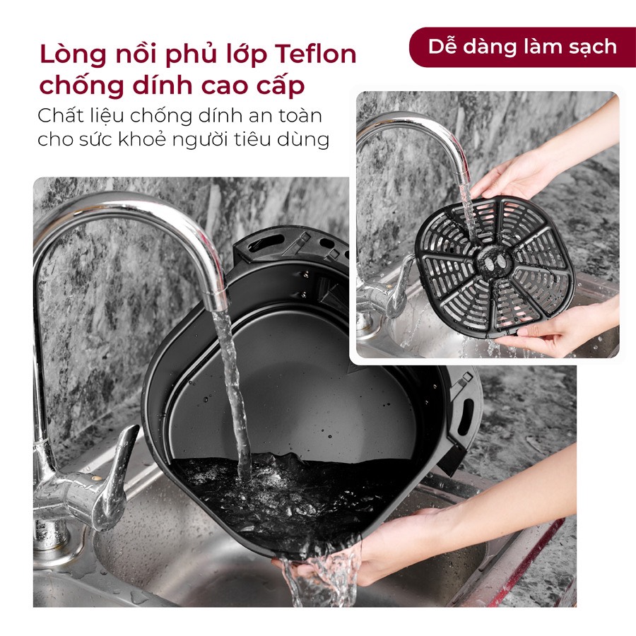 Đặc điểm nổi bật: Dung tích sử dụng 6.89 lít có thể nướng gà nguyên con khoảng 1.5 kg Công nghệ chiên mềm Heat-Q ngoài giòn, bên trong mềm ngọt Lòng nồi bằng nhôm phủ