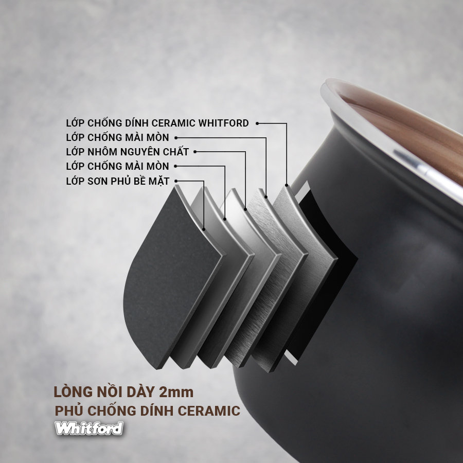 Chống dính Whitford cao cấp ngăn chặn cơm bị dính cháy và dễ dàng vệ sinh. Whitford là dòng chống dính cao cấp top đầu thế giới, đây là chất chống dính khoáng đá tự nhiên với cấu tạo 5 lớp cho khả năng chống dính cực tốt, không chứa PFOA, siêu bền và an toàn cho sức khoẻ.
