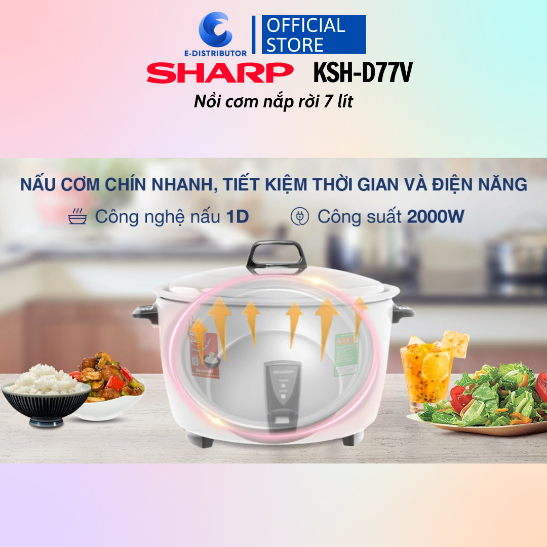 Nồi cơm nắp rời Sharp 7 lít KSH-D77V nhập khẩu từ Thái Lan, nấu cơm chín nhanh nhờ công nghệ nấu 1D, dung tích lớn 7 lít, nút gạt dễ thao tác,... hỗ trợ chế biến khẩu phần cơm cho gia đình đông người hay quán ăn.