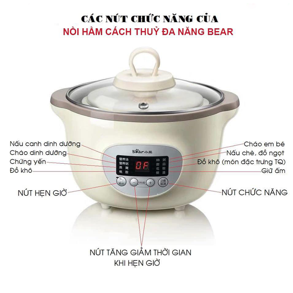 - 2 Cốc sứ 0,5L THÔNG SỐ SẢN PHẨM Điện áp: 220V 50Hz Công suất: 270W Dung tích nồi: 1.6L Lồng hấp chất liệu PP cao cấp. Khối lượng: 3.5Kg HƯỚNG DẪN SỬ DỤNG Nồi Bear 1.6l có 3 chế độ là hầm nhanh, hầm chậm và tự động cho mẹ dễ dàng chọn để phù hợp với quá trình chế biến các loại đồ ăn Thiết kế xinh xắn đáng yêu, nhẹ nhàng rất dễ sử dụng nồi Bear 1.6l và vận chuyển đi theo khắp mọi nơi Trên màn hình điều chỉnh có hướng dẫn 6 chế độ: Nấu, hầm, cháo, tổ yến, súp, và giữ nhiệt (Hình ảnh minh họa bên dưới mình đã được dịch ra do chữ viết Đài Loan nên bạn khó đọc) Cách sử dụng nồi Bear 1.6l: mẹ chỉ cần đổ gạo hoặc thức ăn vào nồi, bật lên và chọn các chế độ đã được set up trên màn hình. Sau đúng thời gian định lượng cụ thể thì đã có những bữa ăn thật ngon cho con trẻ Ngoài ra, một hướng dẫn sử dụng nồi Bear 1.6l khác mà mình muốn chia sẻ: khi muốn kết hợp hâm, hấp thức ăn thì chỉ cần bỏ xửng hấp lên trên và đậy nắp lại nữa là xong. Thao tác đơn giản, nhanh chóng và rất tiện lợi